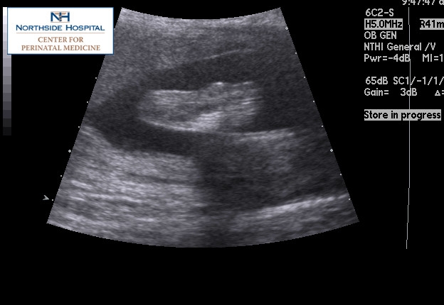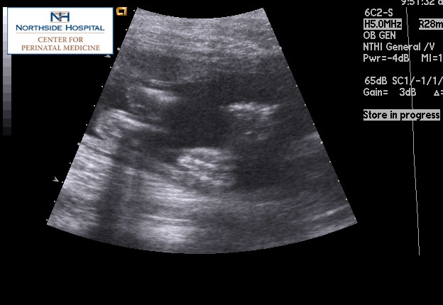 DH and I just got in from my perinatal doc. Michael is weighing in at 1 lb 14 ozs (I'm kinda freaking out, as that seems big), and looks good. Here's a pic of him pushing his hands and feet against me, and another of just his feet.