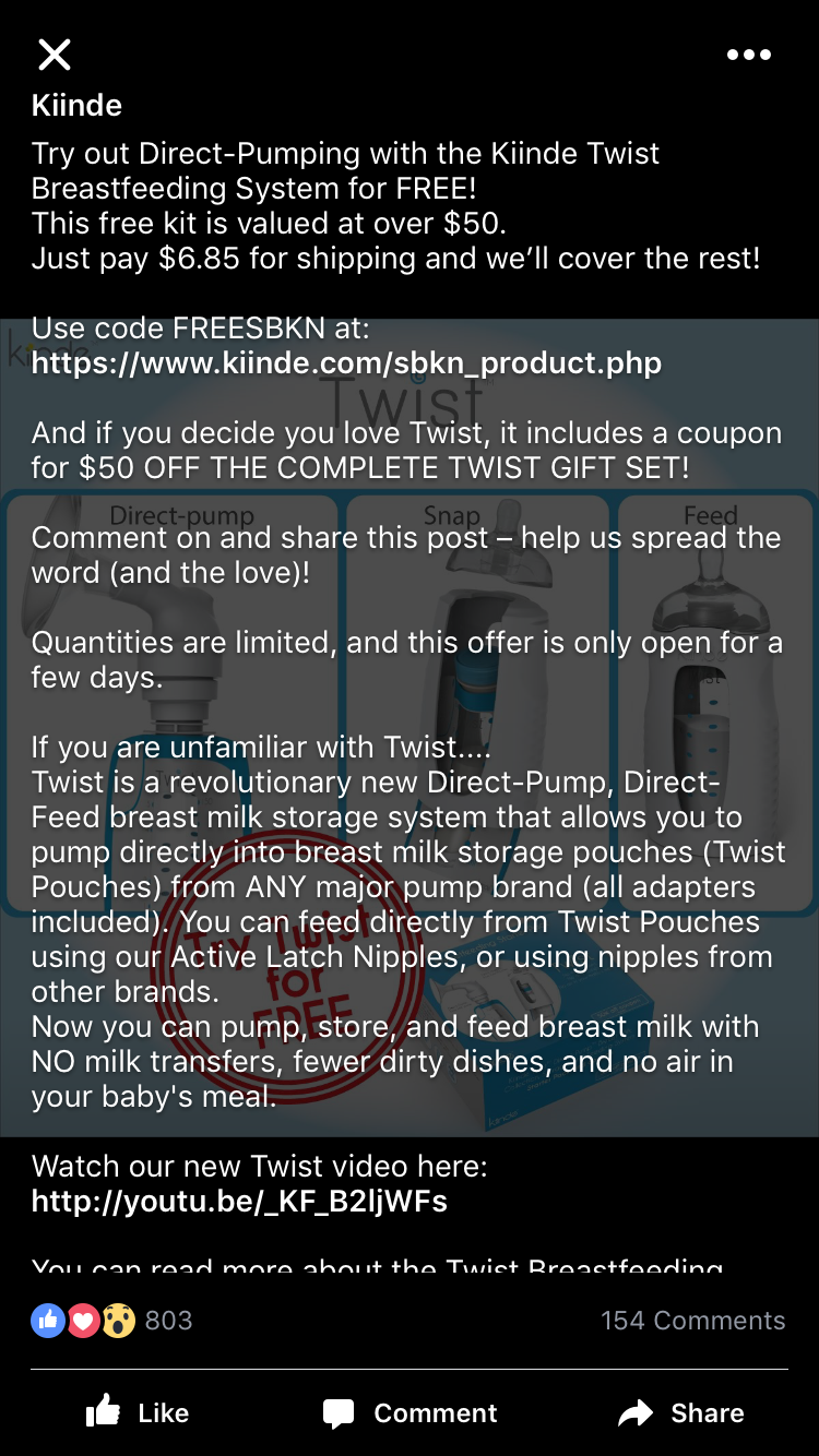 I can't figure out how the eff to just paste the link but for those interested in trying out the kiinde thing they have a deal where you get a small starter kit just for shipping.