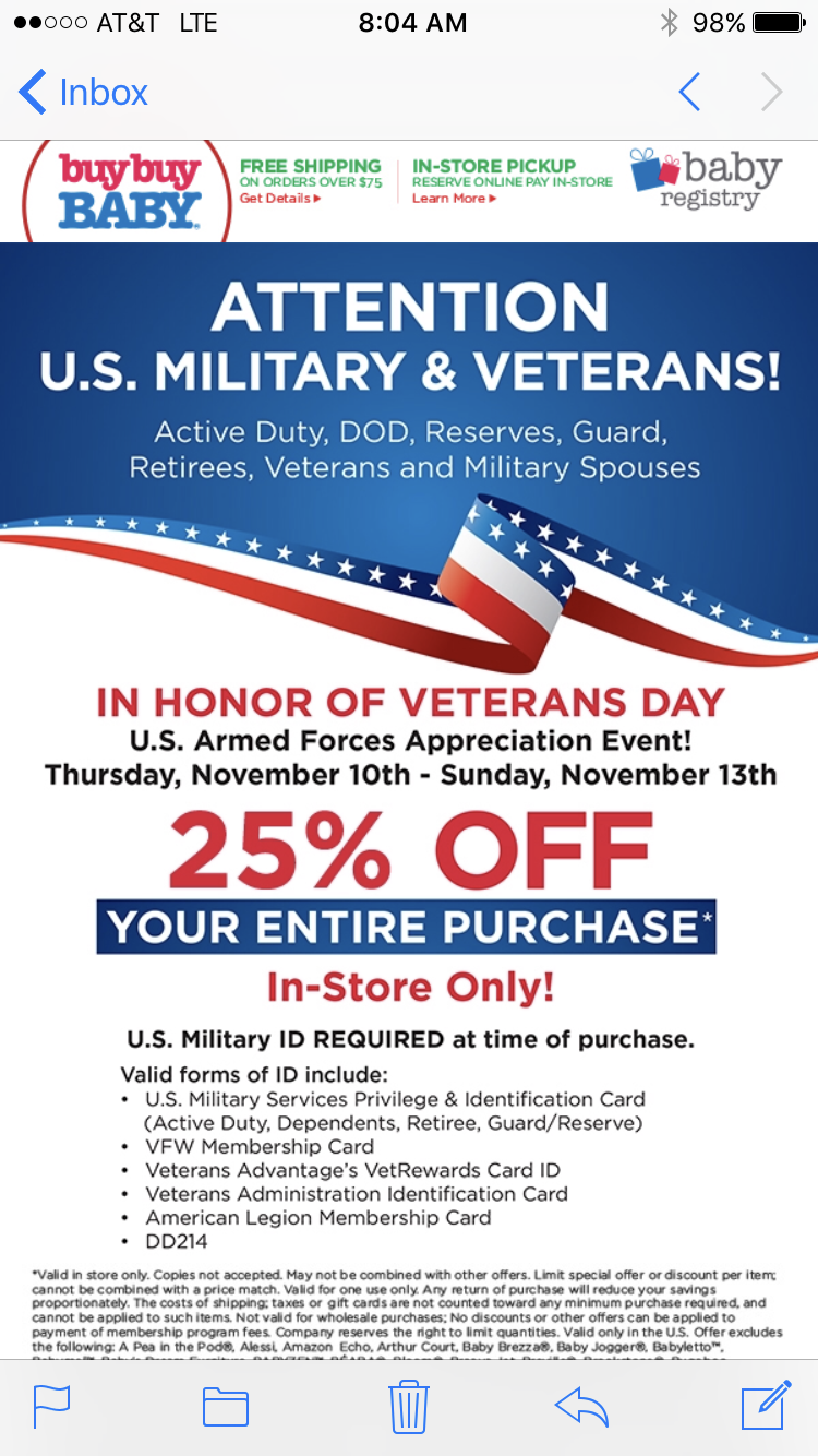 It was an email. It looks like both Buy Buy Baby and Bed Bath & Beyond are doing this. It just says to bring in your military ID (no copies).
