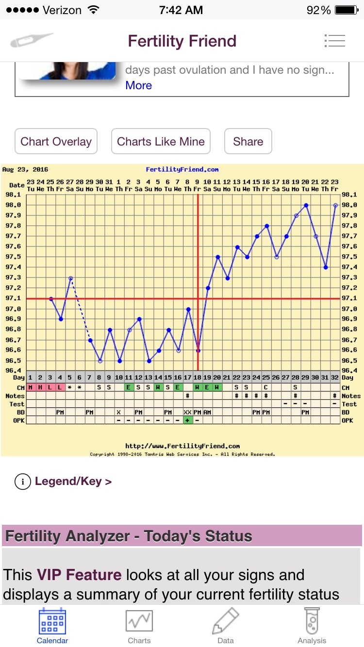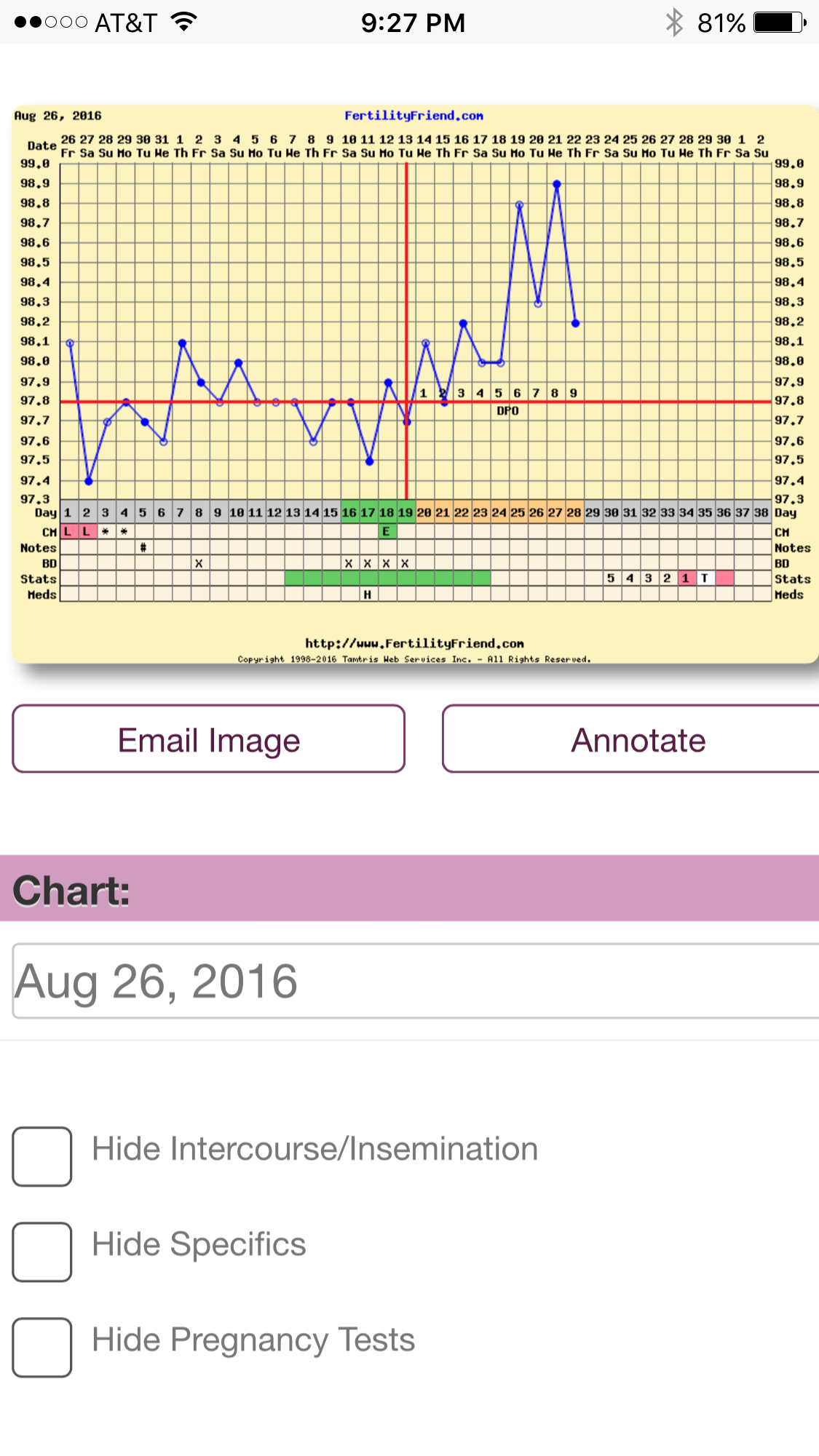 thanks @SoonToBeMommaHowe & @RiverSong15! I did have another day of EWCM but it's recorded in my paper temp chart. I don't always think FF is accurate because my RE and FF don't always agree on my O date. I did remove the one day of it on FF to see like you said @RiverSong15 and it pushes my O date way back to the CD24. The only reason I think that probably isn't right is because I had my follicles monitored super closely and triggered. That isn't saying the trigger did or didn't work or make the egg(s) release, so I have no clue. If I did O late, then I am probably out because I didn't BD anywhere near that. We actually can't during my TWW because I am on (vaginal) progesterone injections and they are gross.