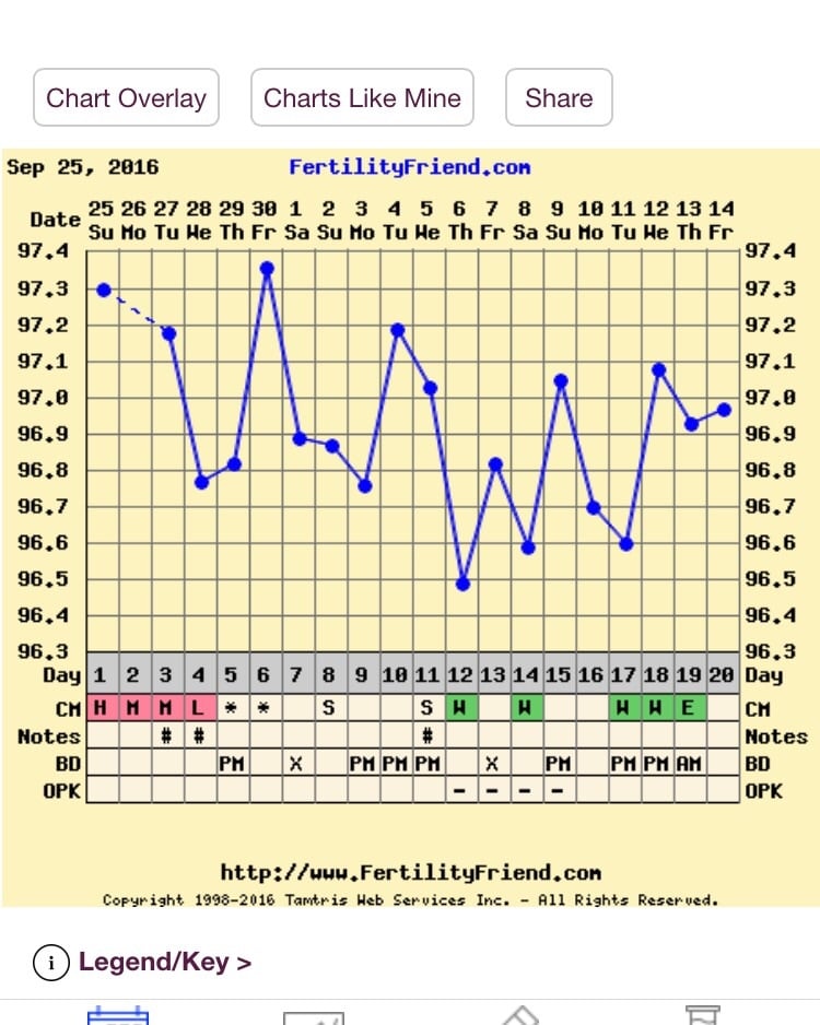 Well my temp spiked today and I took it early, so hopefully that means I've ovulated! My chart is a mess this week because of sleep deprivation. I took 2 temps Monday because I woke early and then went back to sleep and woke up 3 hours later. They are .45 degrees apart. And then I took 2 temps yesterday 97.54 and 97.63. Believe it or not if one is entered versus the other, it changes my O-day. Because EWCM did not dry up til last night/this morning, I'm going with yesterday which gives us -3,-1 timing. It also makes it 72 hrs post OPK +. Either way, I'm super concerned that the egg(s) I ovulated are bad since it seems like I geared up to ovulate and just couldn't. I will be a mess if I do get KU.