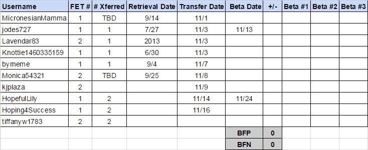 SA = normal; HSG = clear; history of DVT/PE Diagnosed with unexplained infertility IUI #1- April '16 - BFN IUI #2 - May '16 - BFN IVF Fresh Xfer #1 (1 blastocyst) - Sept '16 - BFN FET #2 - 11/8/16 (2 blastocysts) - Beta on 11/18 4 more blastocysts on ice