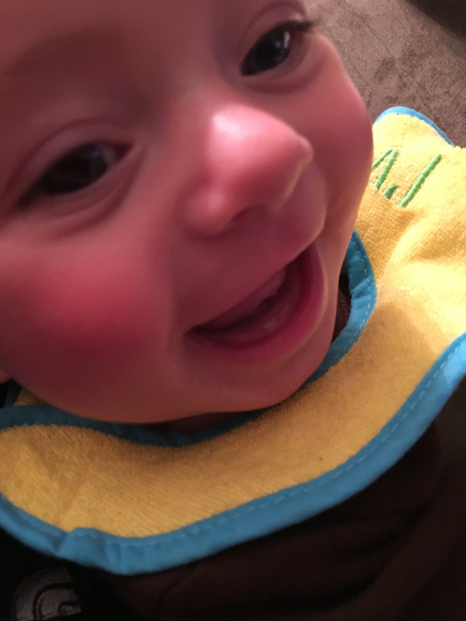 Ok ibreally think he is teething now, I will be shocked if we don't see a tooth soon. His gums are swell and I see two skinny white spots on the bottom gums. He has been so grumpy the past two days and today was the worst. He wanted to chew so I have him a cold teether, he bite down hard and started screaming and would not stop for like 30 min, even nursing didnt help. He was due for a nap too so we gave him Tylenol and DH is letting him sleep on his chest. if a tooth doesn't pop through then I am at a total loss as to what is going on with this kid.