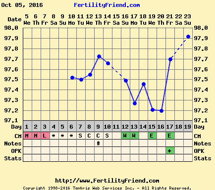 @Pepper16 thanks! When I put in a temp for tomorrow I get crosshairs on cd16. This is my first month temping so I just wanted to be sure! Also my first month using opks. They came in Monday and I was trying to use them in the afternoon and was only getting faint second lines. I drink a TON of water all day so I was worried anything other than fmu might be really diluted. When I woke up to that temp spike I decided to try an opk with fmu and it was positive. Either I have a really short surge and missed the beginning or I need to just use fmu.