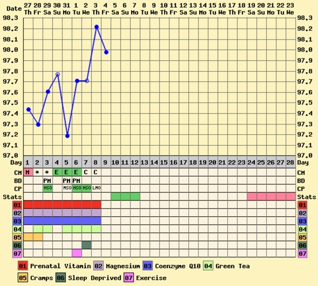 WAYDTGKU: BD, temping, checking CM and CP, green tea, PNVs, magnesium, CoQ10, limiting caffeine