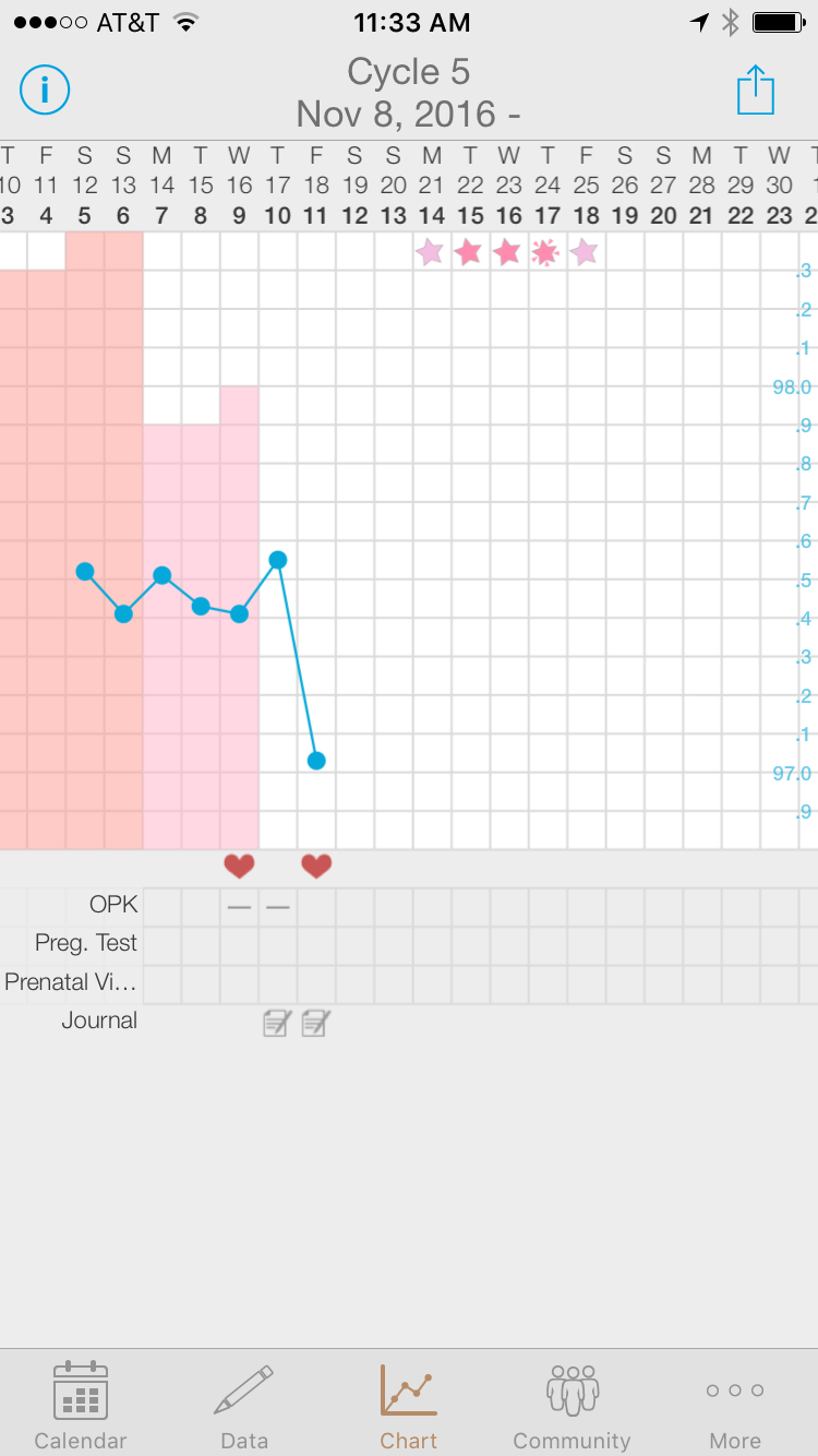 @metrogirl I'm sorry for your TW in your chart. I'm not sure what to say about your temps. For me, if I wake up early and temp early, my temp is pretty much always lower than normal time. Sometimes if I have one of those days, I'll try a middle temp like 97.46. It looks like you have OPKs that support the CH but no EWCM so... that's a really long-winded way of saying I dunno, keep HIO until you have more data. If you're both in need of a break, I don't think that taking a day off would be a bad thing.