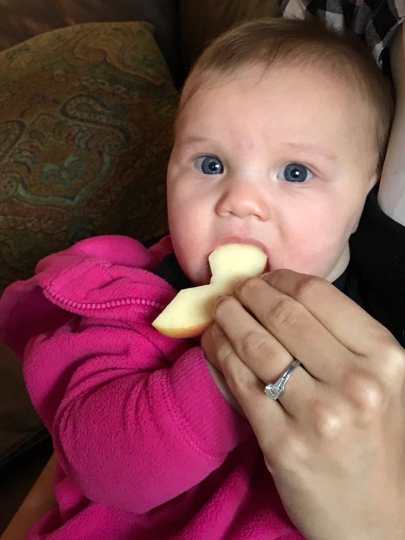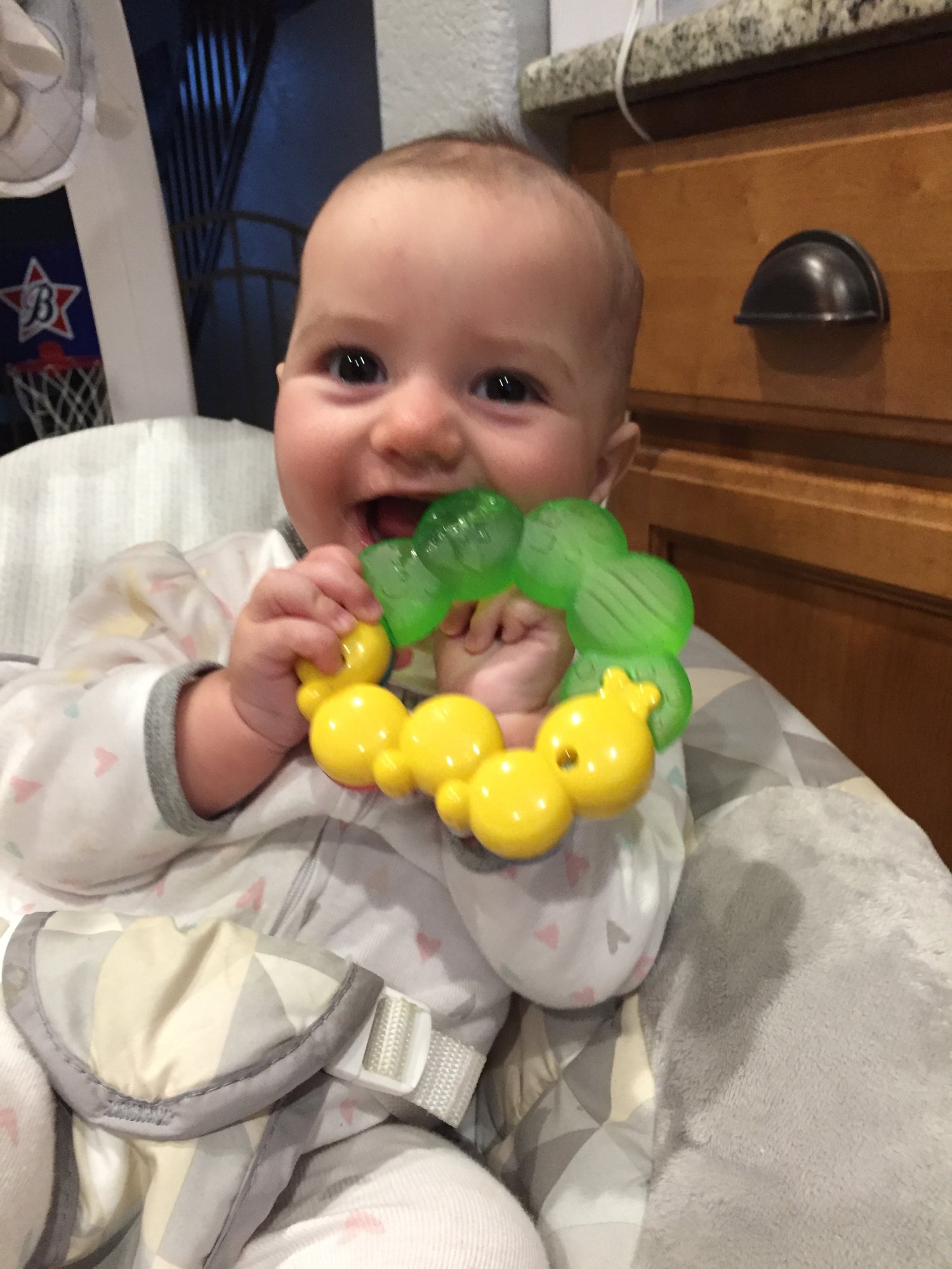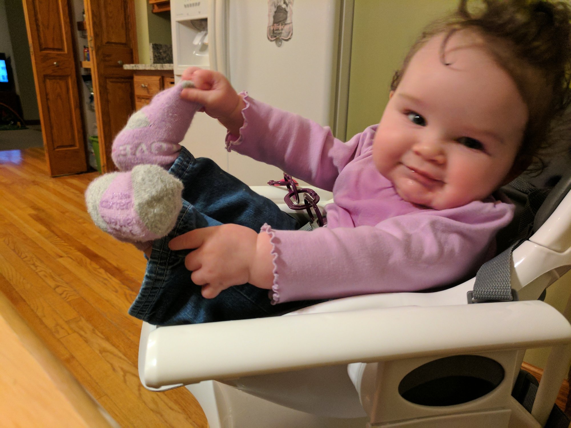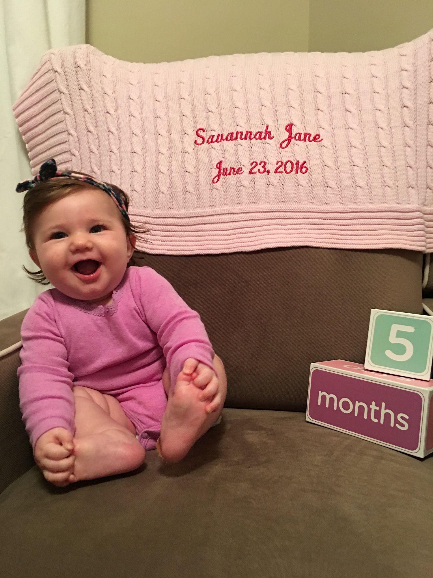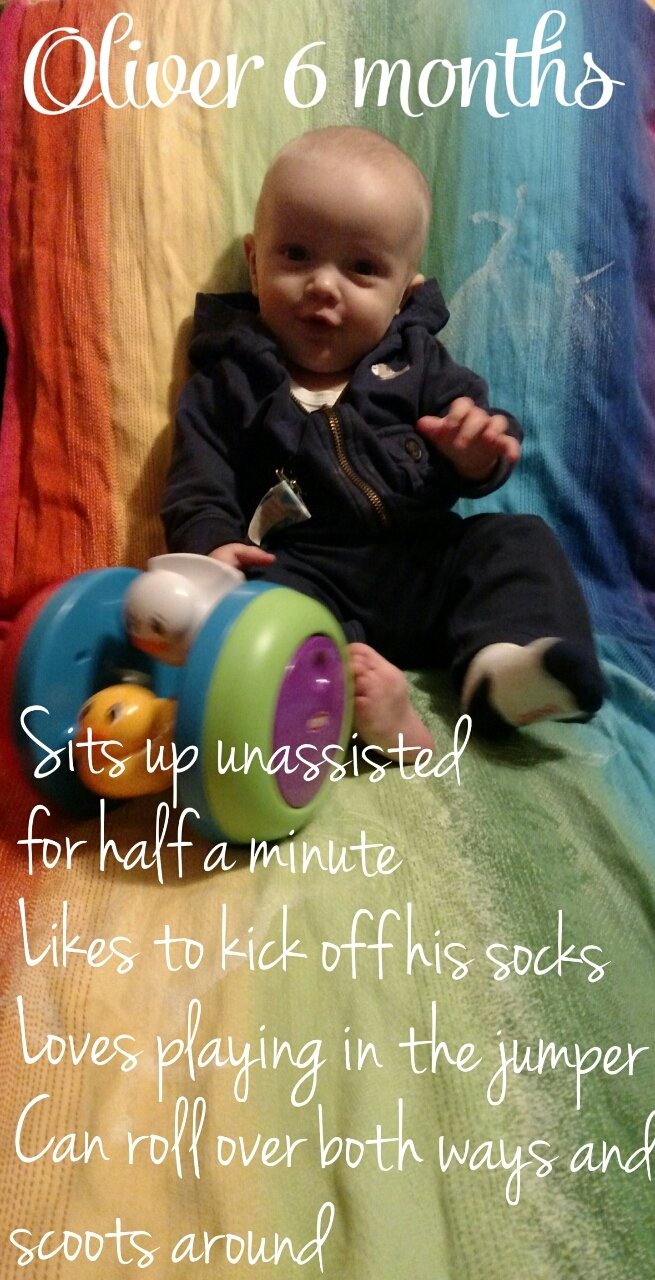 Charlotte will be 6 months on Saturday. She pulls herself up in her bouncer and swing and likes to just sit up. She's been munching on her hands nonstop but no sign of teeth. I love seeing how big all our babies are getting.