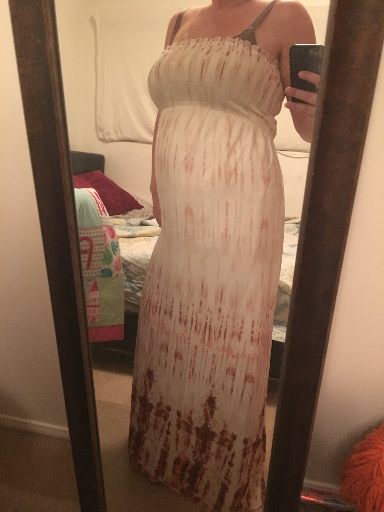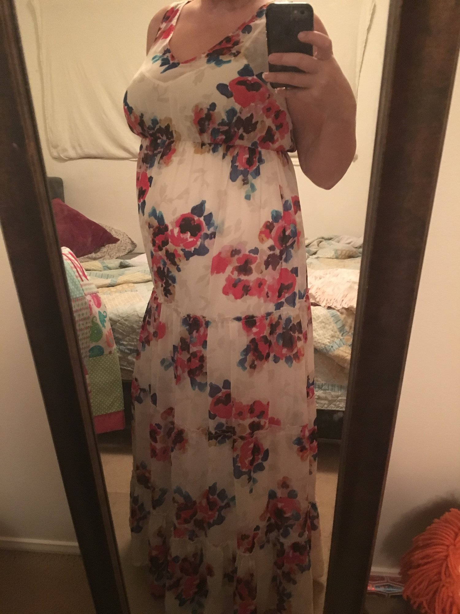 First time attempting a photo upload, hope you can see! This is one of the dresses I got from Motherhood Maternity for $25, I'Il post the other one too. I'm 5'8" with a 38D bust and the Large fits perfect, with lots of belly room to grow into.