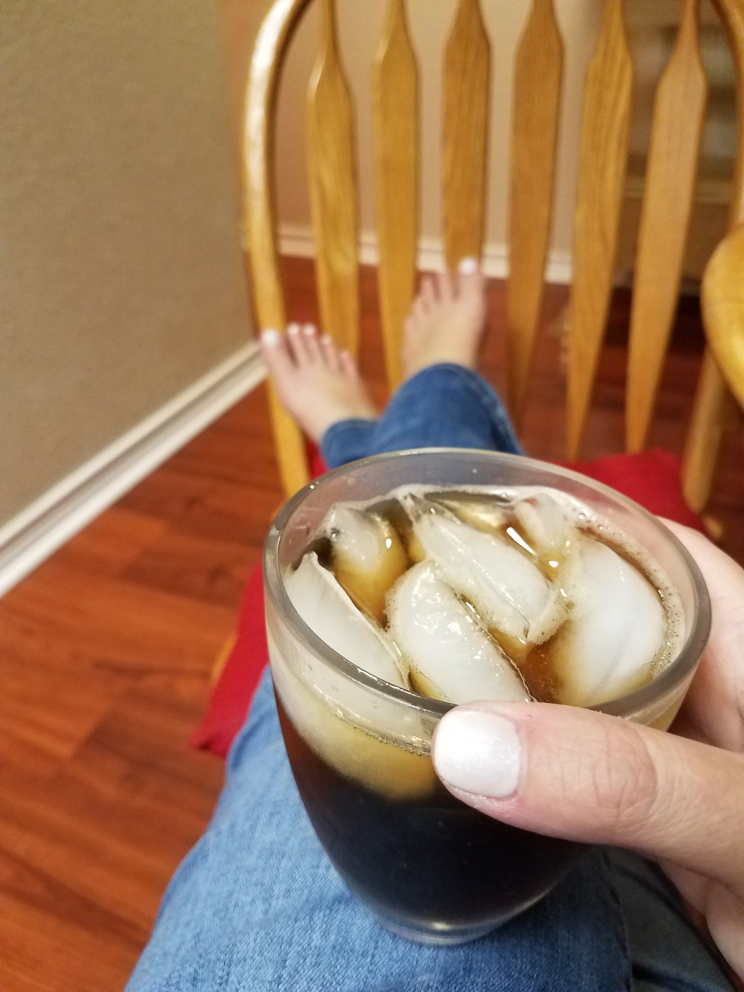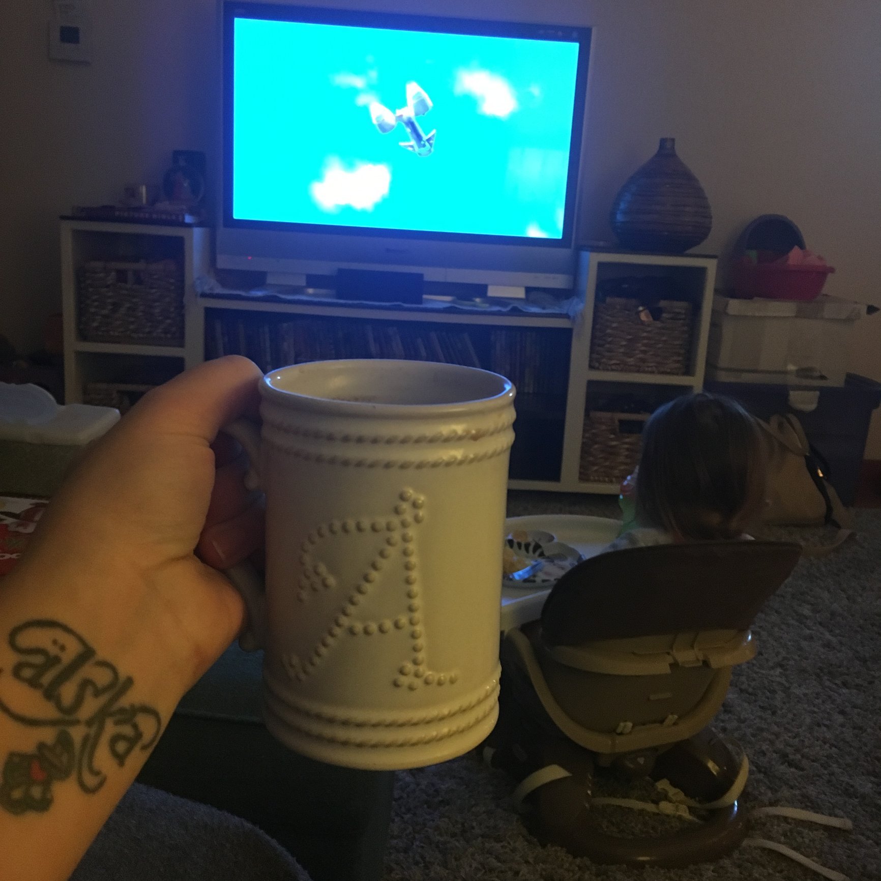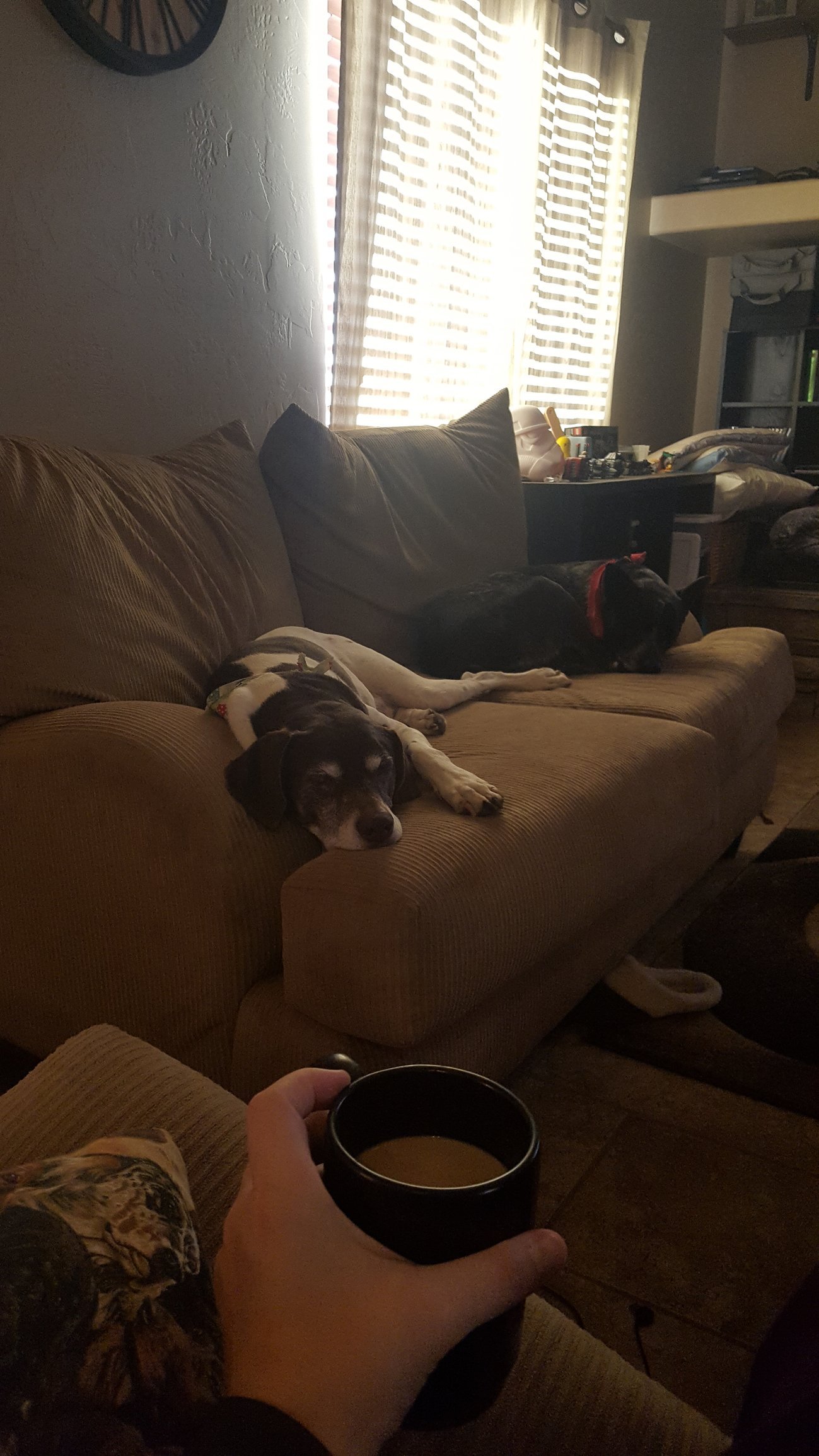 Drinking coffee. Baby next to me in the swing. 2 of 3 dogs lounging on that couch and the other dog on the ottoman.