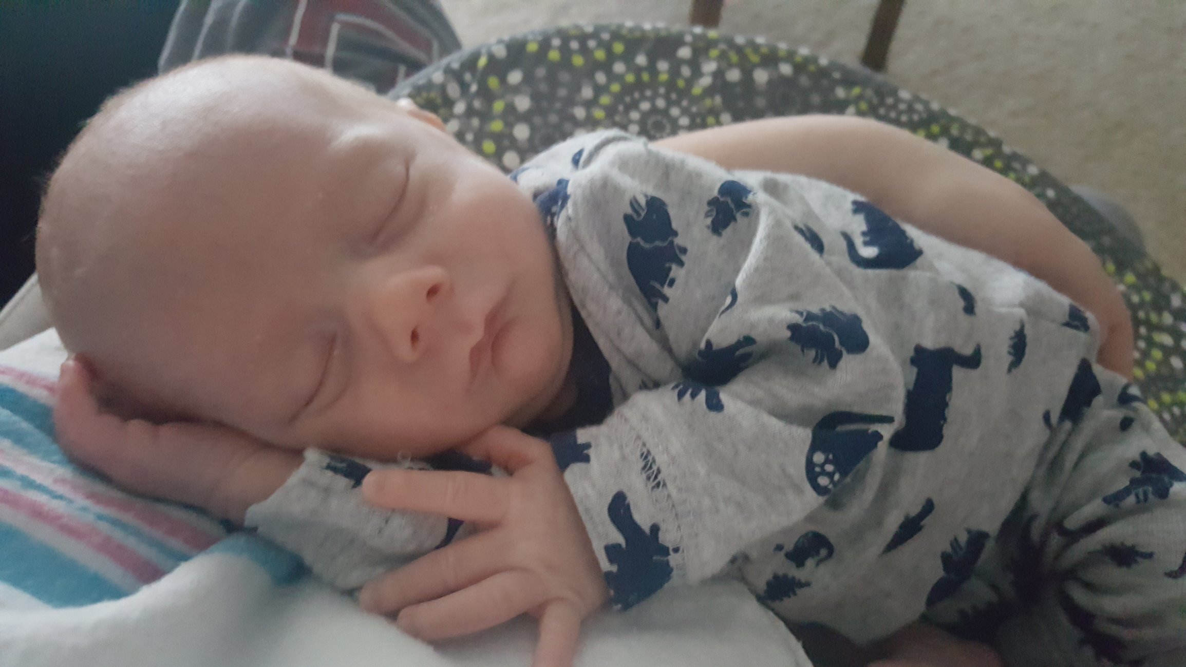 DS is laying on my shoulder sucking on his pacifier, which seems to keep him content for the moment.