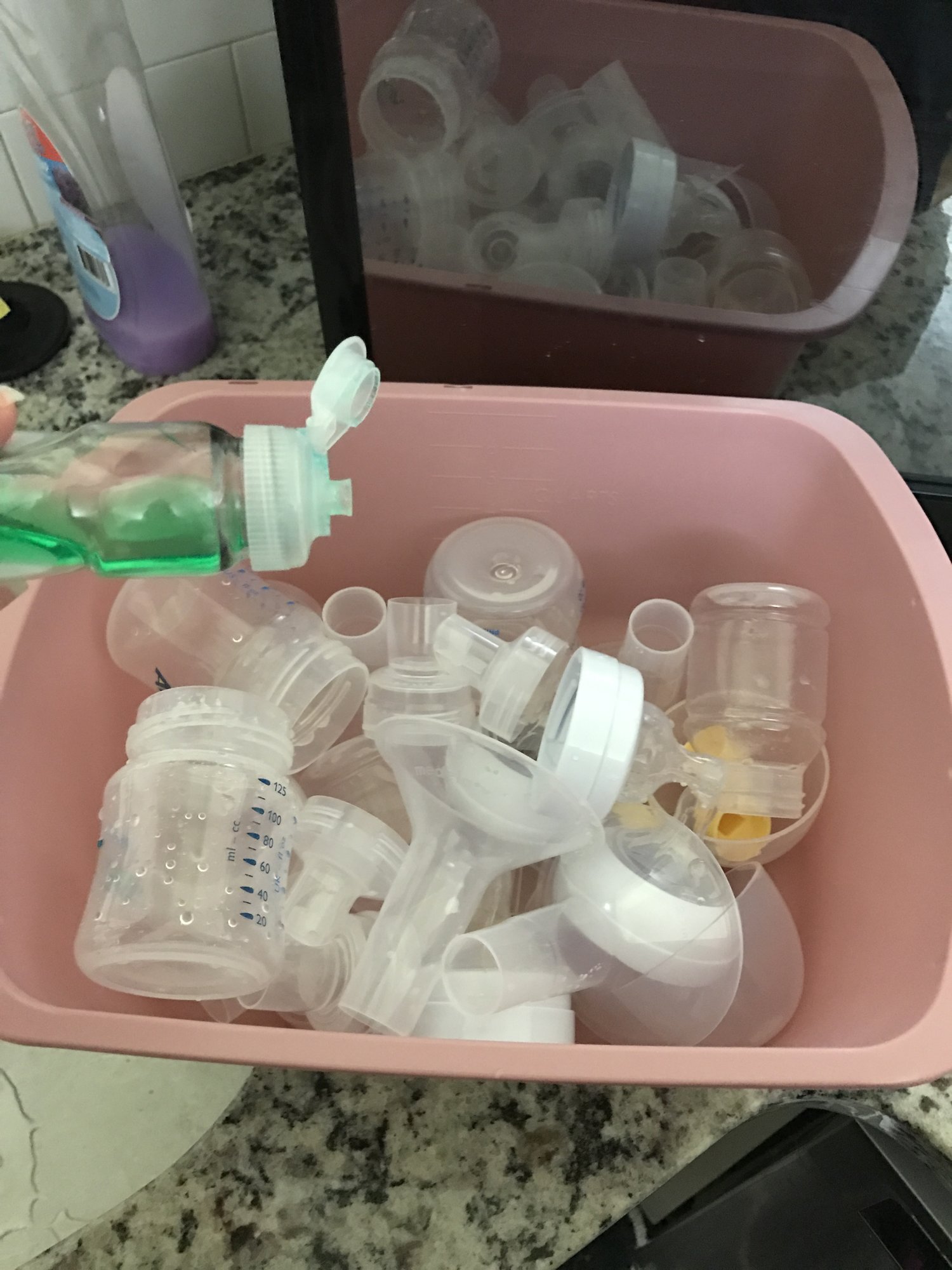 Washing bottles and pump gear one last time before bed, then I'm going to have some tea and wait my turn for the shower.