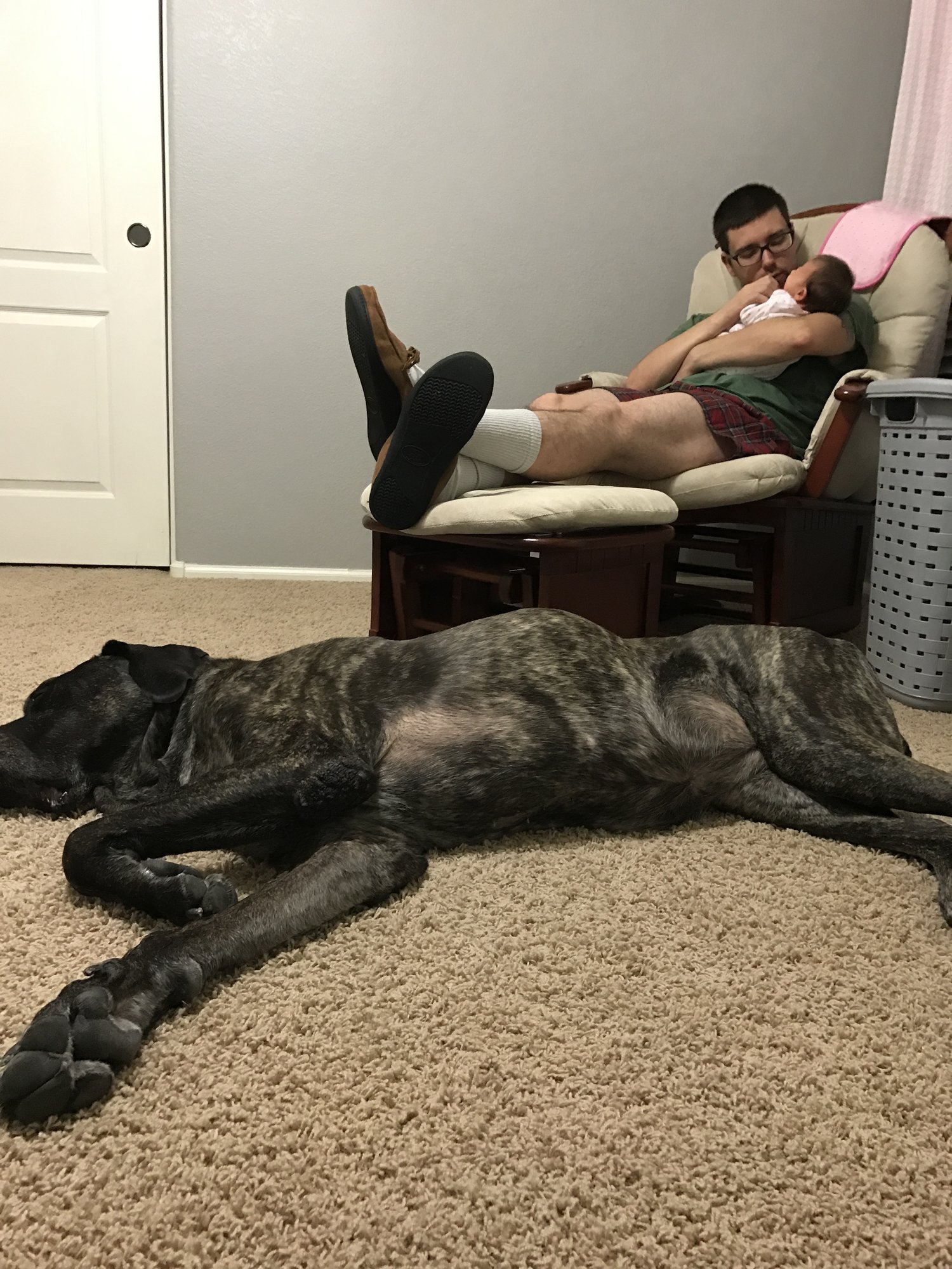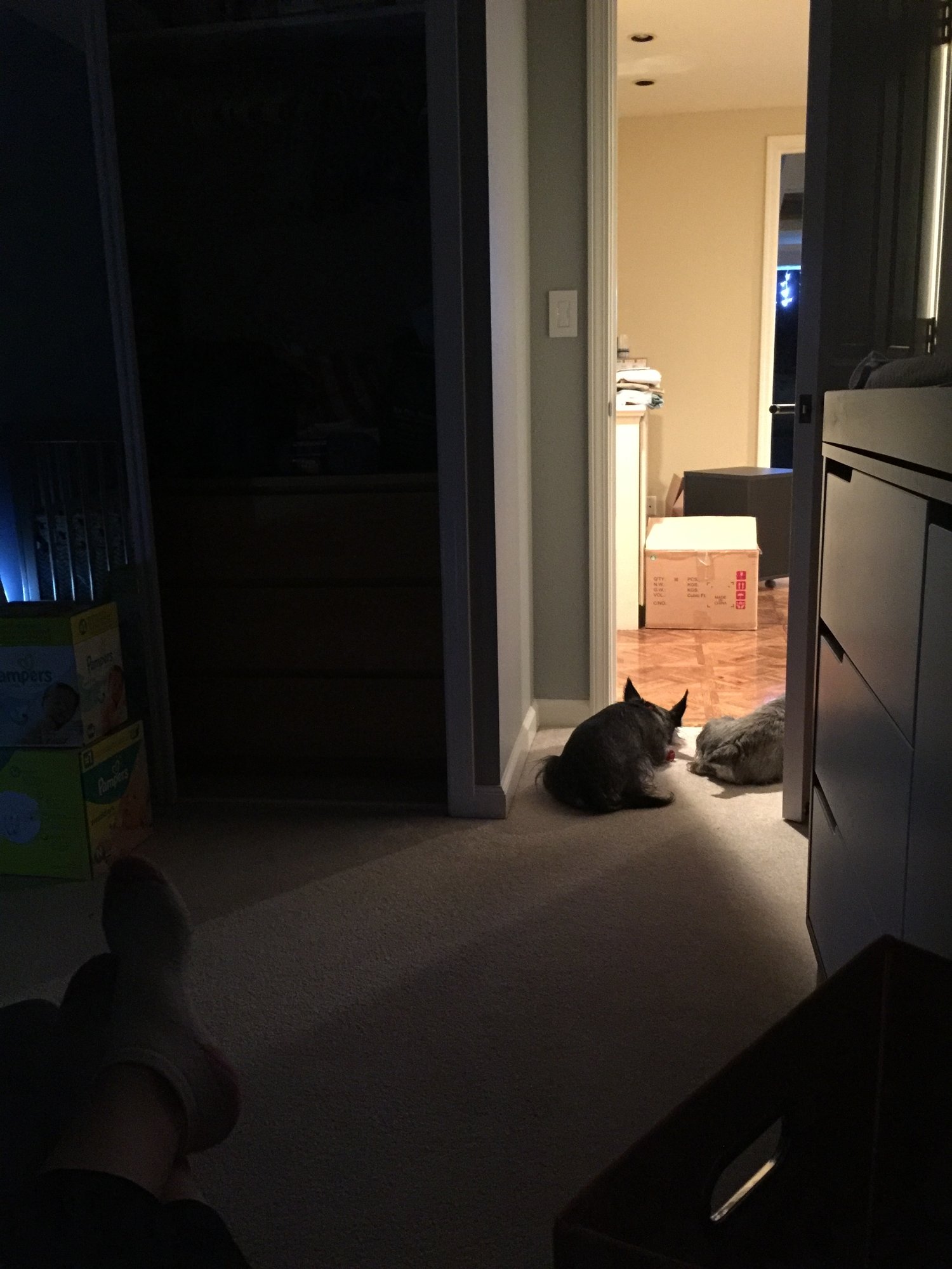 Currently on minute 44 of an epic nursing sesh with two protective Mini Schnauzers guarding the door.
