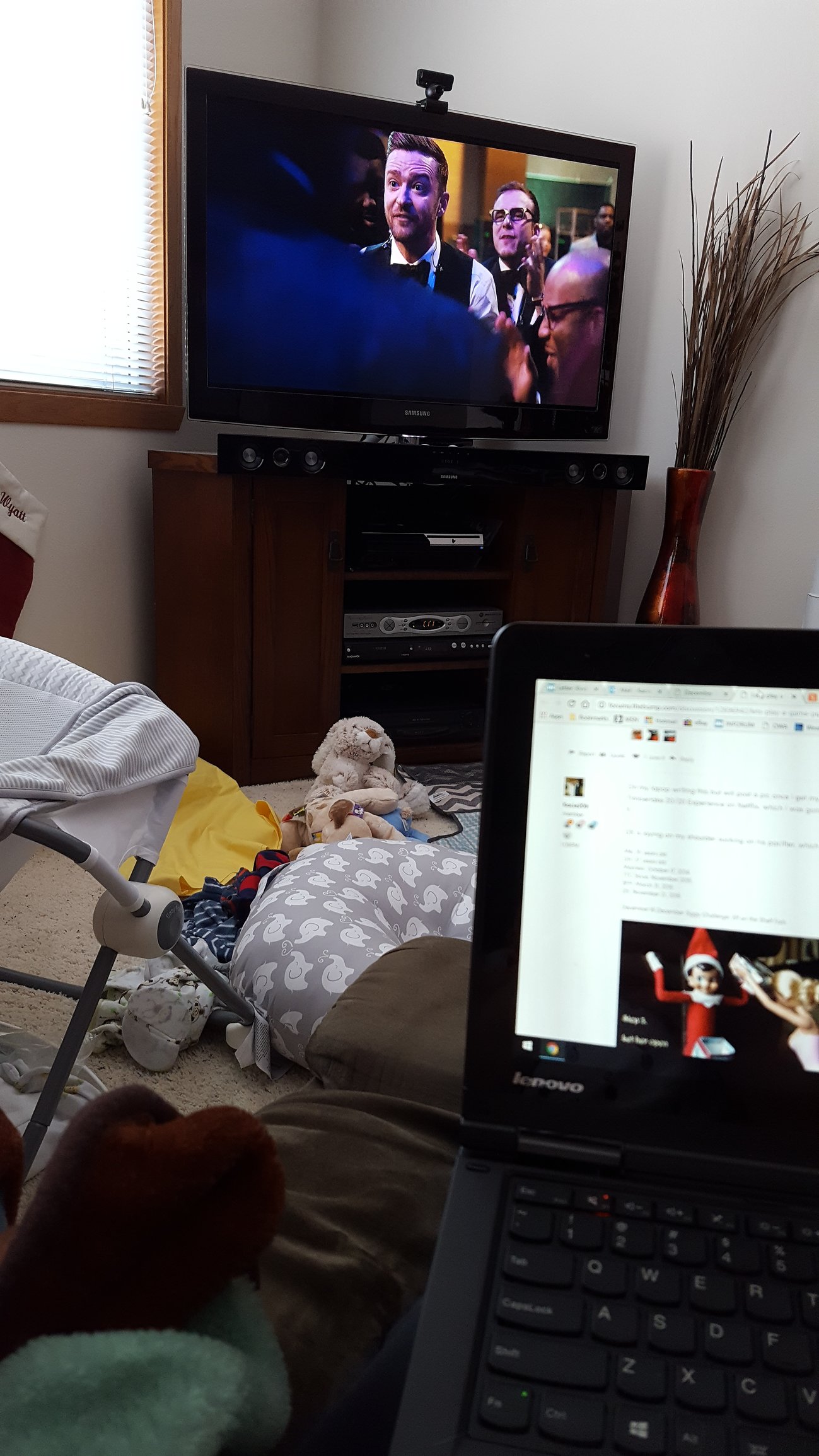 On my lapop writing this but will post a pic once I get my phone (charging). But, currently watching the Justin Timberlake 20/20 Experience on Netflix, which I was going to do before DS was born and completely forgot about it.