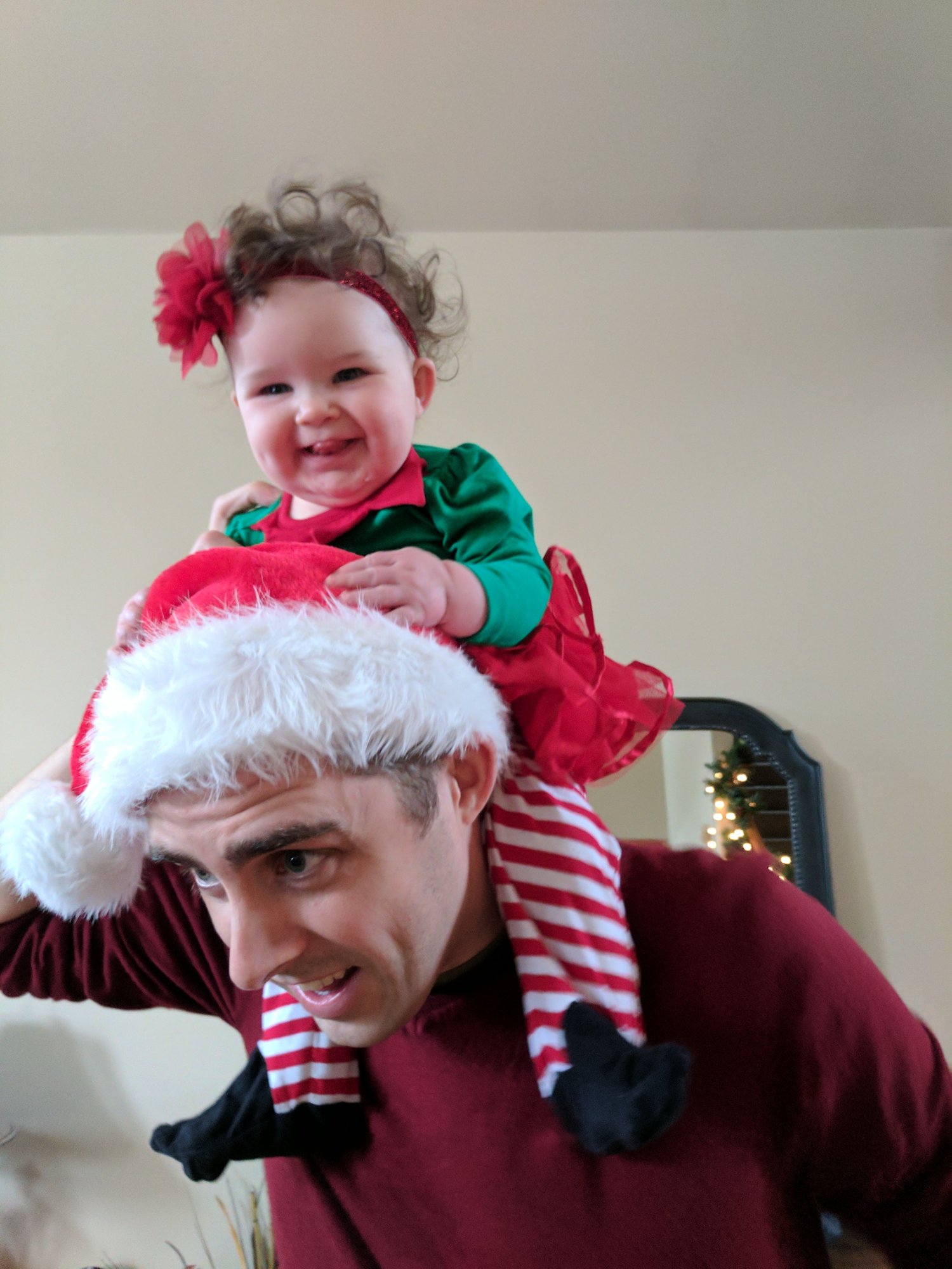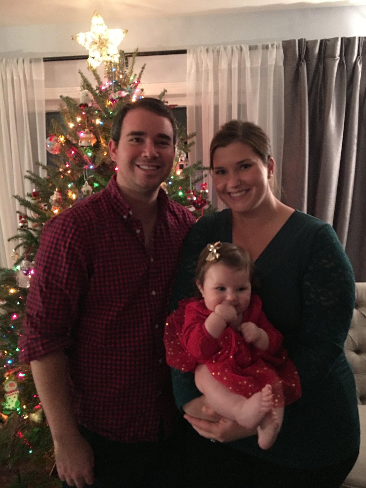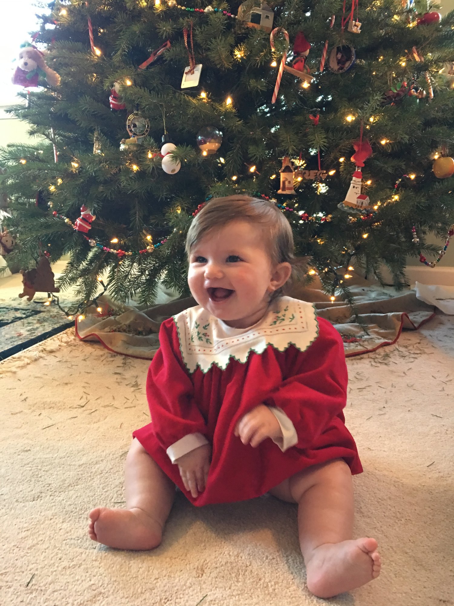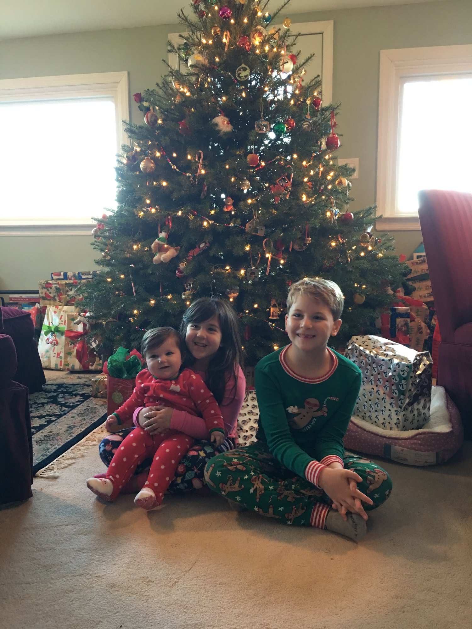 Savannah with my niece and nephew at my parents all in pajamas on Christmas morning (our tradition) and then Savannah in the dress I wore my first Christmas.