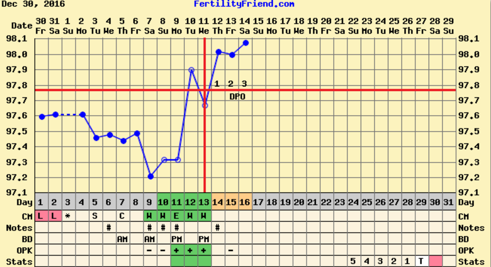 • @WillRunForWine21: Oh ok, I see. Didn't realize the "mon" category was for the OPK tracking. Given you said you got peak on CD 13, but your temp dropped on CD 14, I am a bit confused....sorry I am not more helpful!