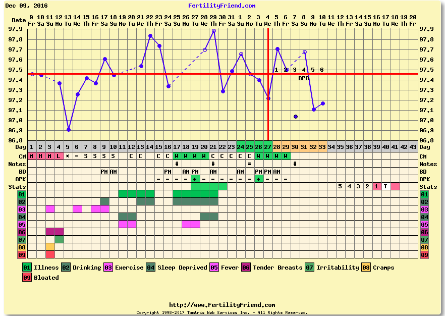 Even though I'm not completely convinced, I think I'm going to leave the CH just so that I can start to expect AF at a certain time (but not worry if I'm 'late'). With DH away for the next couple of weeks, there is nothing I can do if I do O, so I've stopped using the OPKs, and decided to stop charting my CM unless I see something unexpected (like EWCM). I can't help myself, I still temp in the morning, although part of that was to watch and see if I got a temp drop indicating AF coming - not sure that will be useful if things keep on like this.