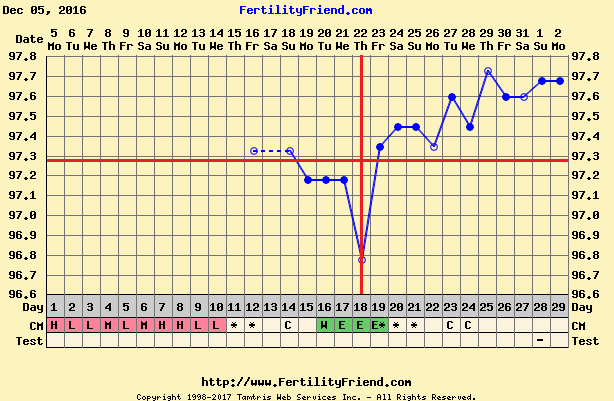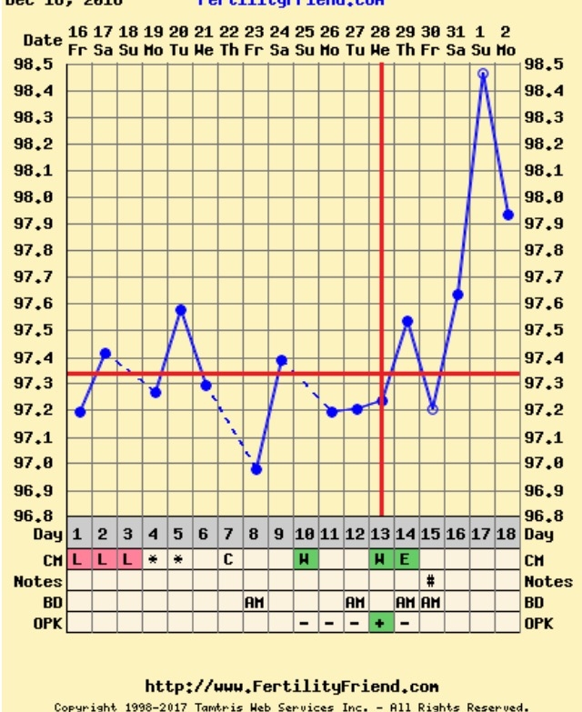 • @babypi I agree with FF on CD18. Also, some women see a big drop the day before or of CD1, while others see high temps throughout their periods, and only get drops after AF is gone. I typically see a big drop, but not below CL, the day before AF. Then I have high/erratic temps during my period, and then my temps decline/dip before O. You'll just have to see what your individual pattern is like, if you don't get a BFP this cycle. Once you know what is normal for you, interpretation gets easier. GL!