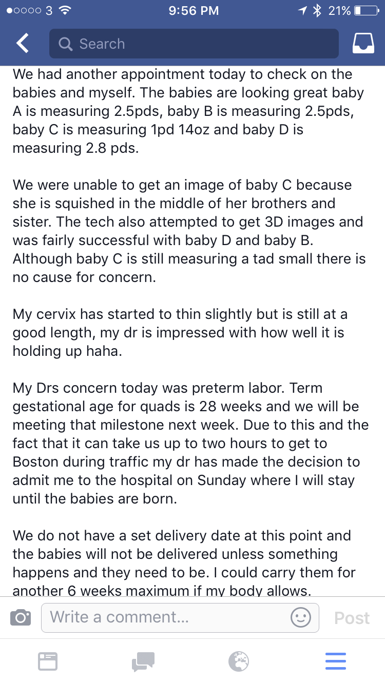 @Gators&BoSox she's doing well! Was admitted to hospital for bed rest right on Sunday. She's 28 weeks and all 4 babes are looking great! I attached her latest "full" update