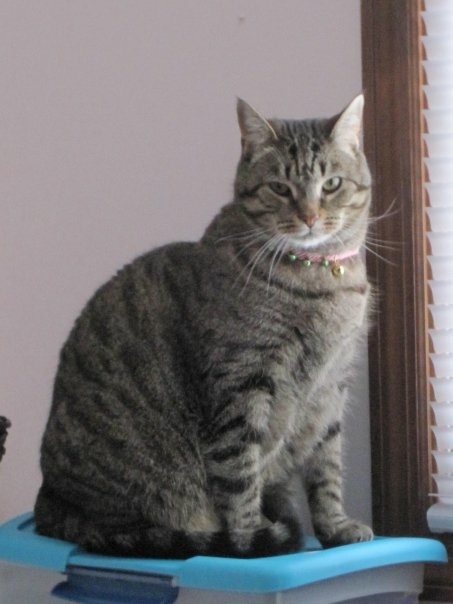 Scarlett- a giant cat who is most likely part Maine Coon. She was the sweetest cat in the world until we brought a kitten home. She's starting to get better, but still isn't her old self