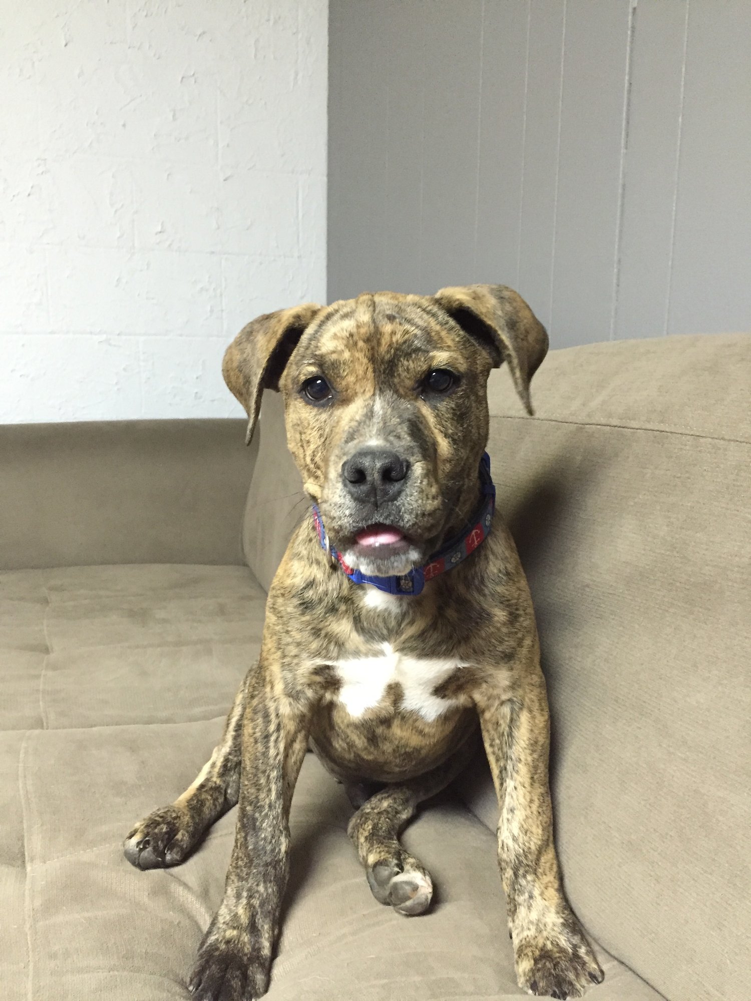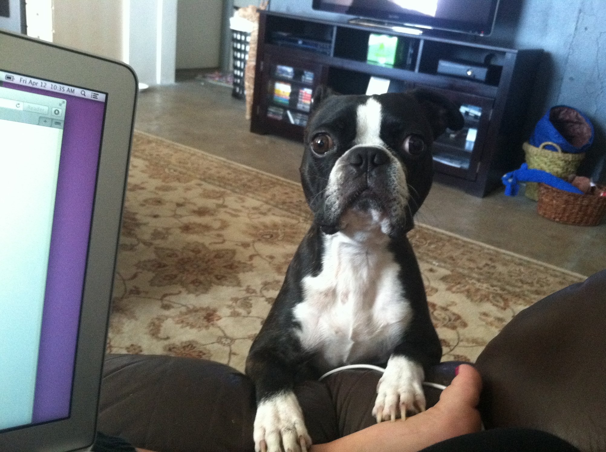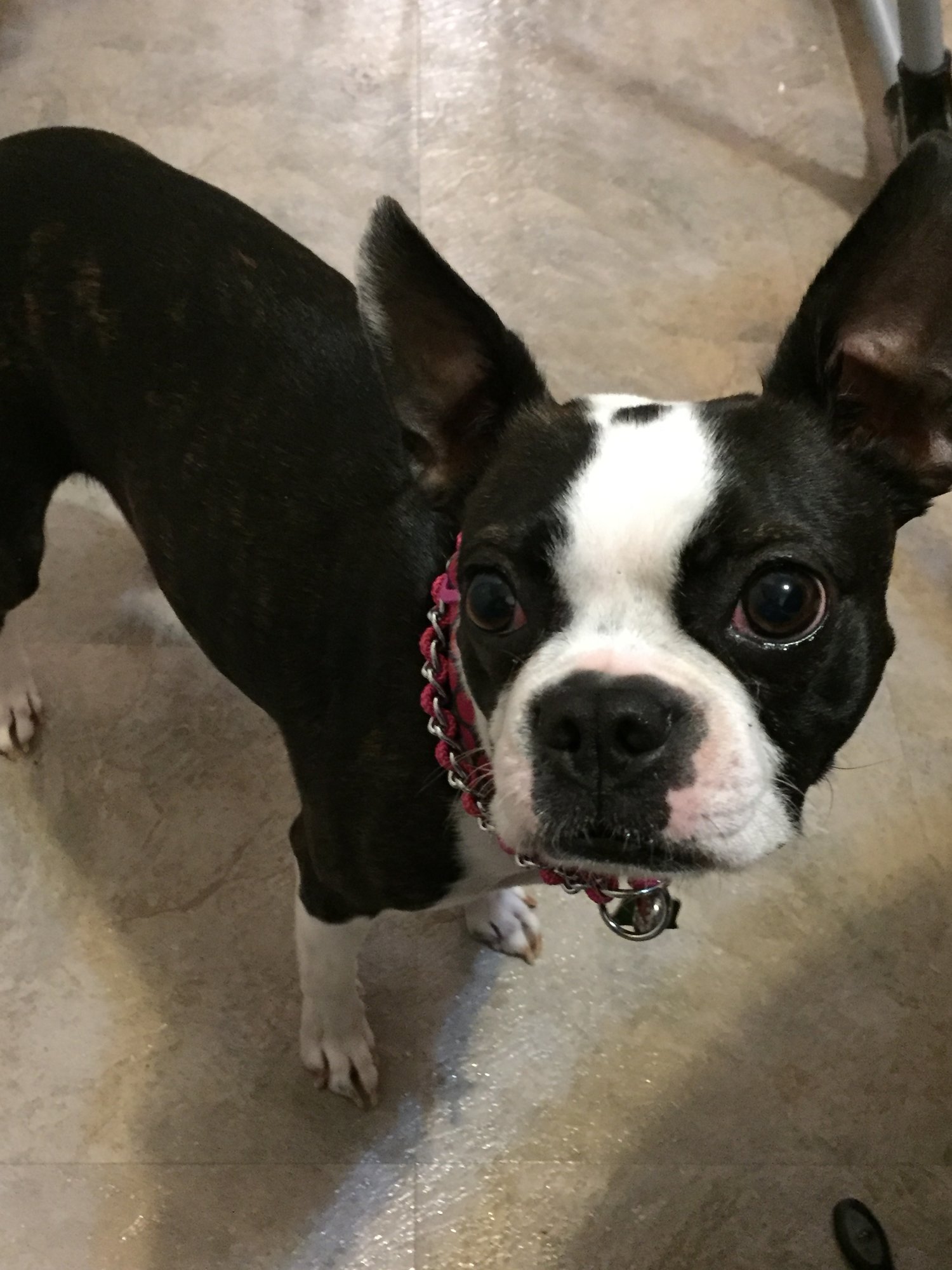 This is Oscar, our Boston Terrier. We have no idea how old he is because he was a stray, but he's the sweetest, laziest, cuddliest guy you'll ever meet. Doesn't have an aggressive bone in his body, and absolutely adores children. I can't wait to see him with our baby!