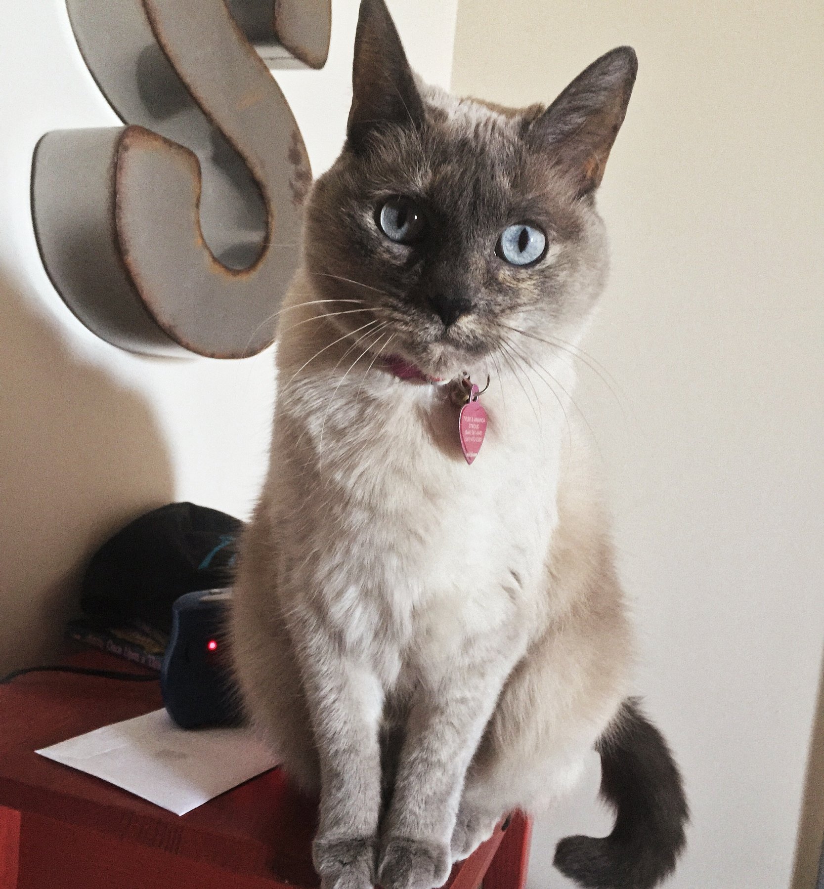 This is our siamese cat, Cambria. We adopted her from a rescue eight years ago. *tw* We got her one week after my first miscarriage, and I like to say that she rescued me as much as I rescued her.*tw* She's absolutely my baby (though she loves DH too). She'e very talkative and friendly, playful and too curious for her own good. And she is absolutely the boss of the dog, though he doesn't seem to mind.