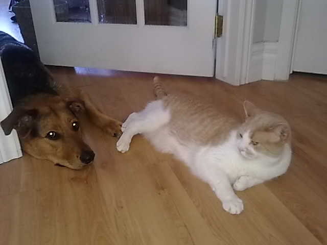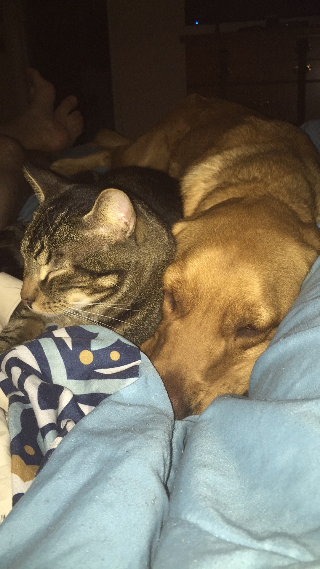 I have 5 pets! 2 fish a dog and 2 cats. These two are inseparable! They really love each other! This is kitty and blaze. Blaze is a lab golden retriever mix I'm not sure what kitty is we rescued him. And my other cat is bear. He is a Persian and really mean. And my two fish are beta fish. Little red and little blue.