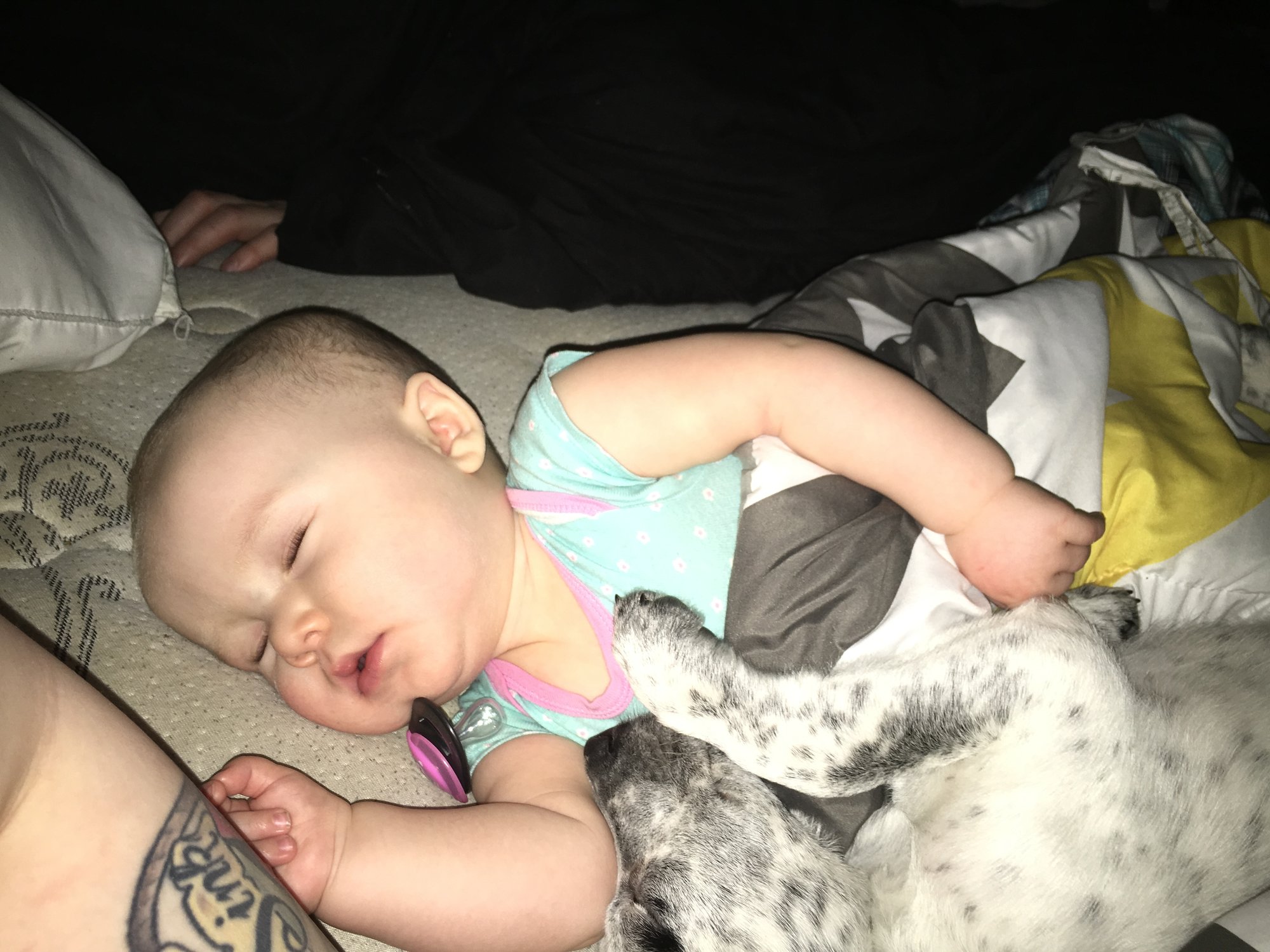 I have a 1 yr old Red Heeler/Great Pyrenees mix named Mia. She has the energy of a small puppy and a big, goofy, playful personality but can be very protective against men for some reason. I imagine it's only going to get worse now that I'm pregnant..& this is our kitty, Gheeda. She's only about 6 months old, loves to cuddle, give licks, and play, and is still just starting to get used to the idea of a dog.