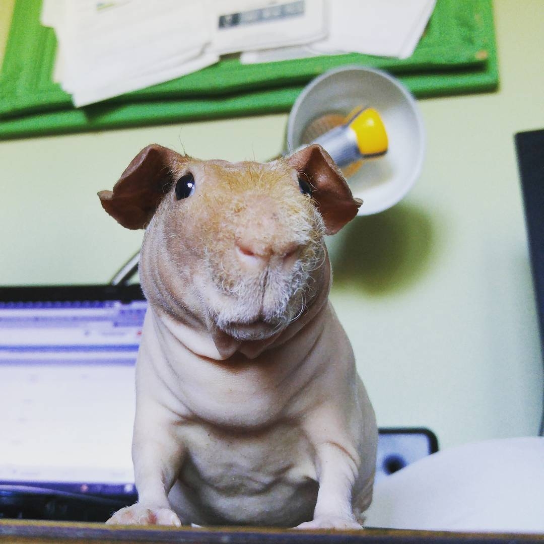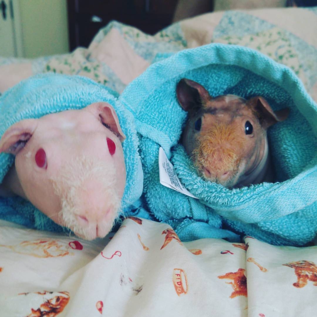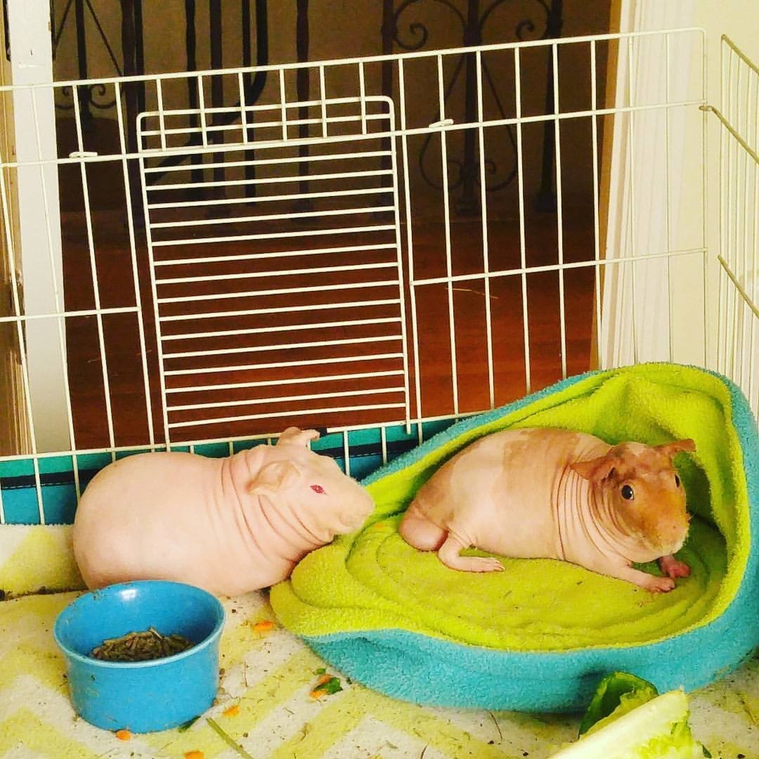 Are you guys ready for my pets? We have two HAIRLESS guinea pigs named Hippo and Dermis. Here's the two of them: Hippo is the albino one and Dermis is the ginger. They were my Christmas gift two years ago, and I'm complete obsessed with them. Here's a statuesque one of Dermis: And here's both of them hanging out in their cage. You can tell who's the dominant pig by who's allowed to be on the bed: