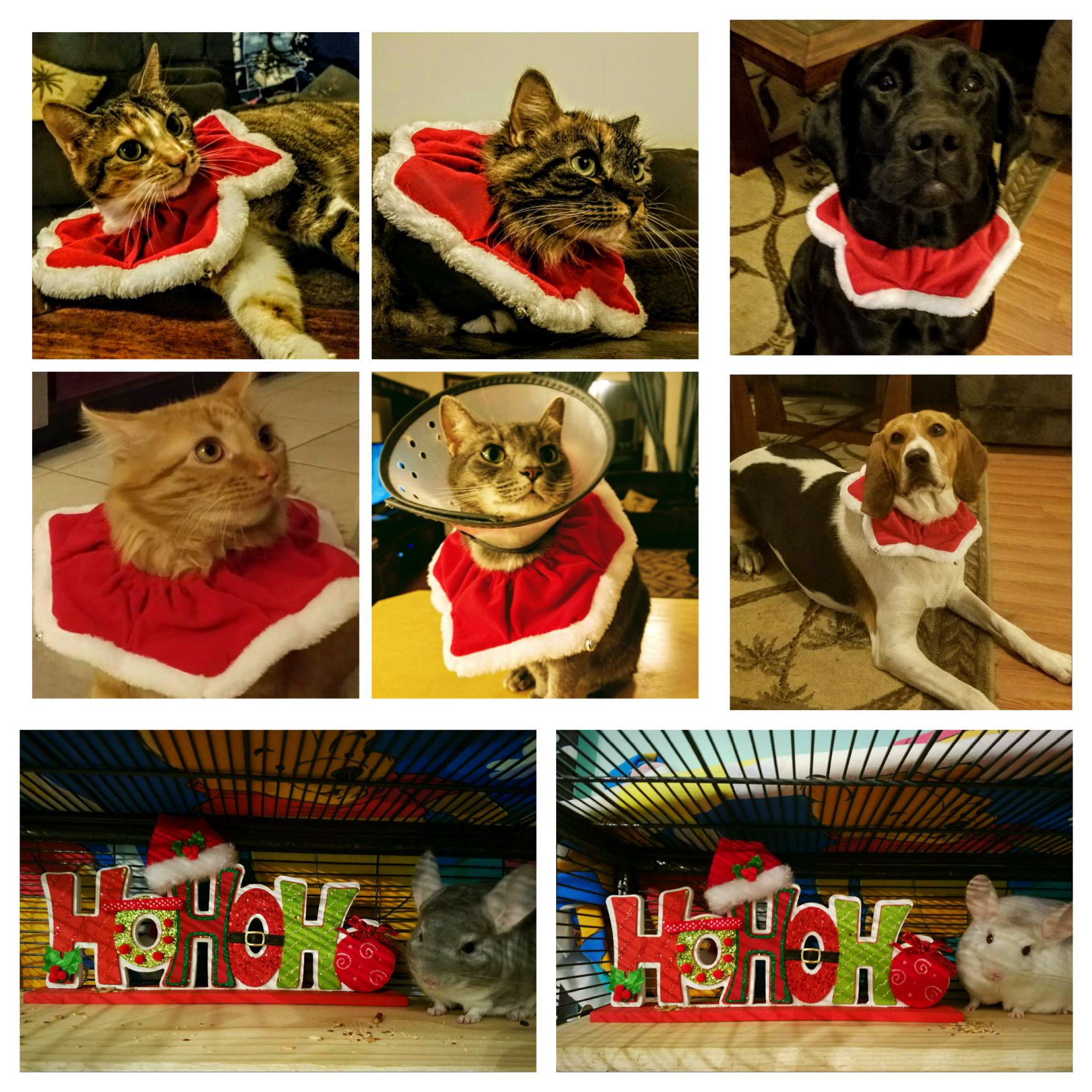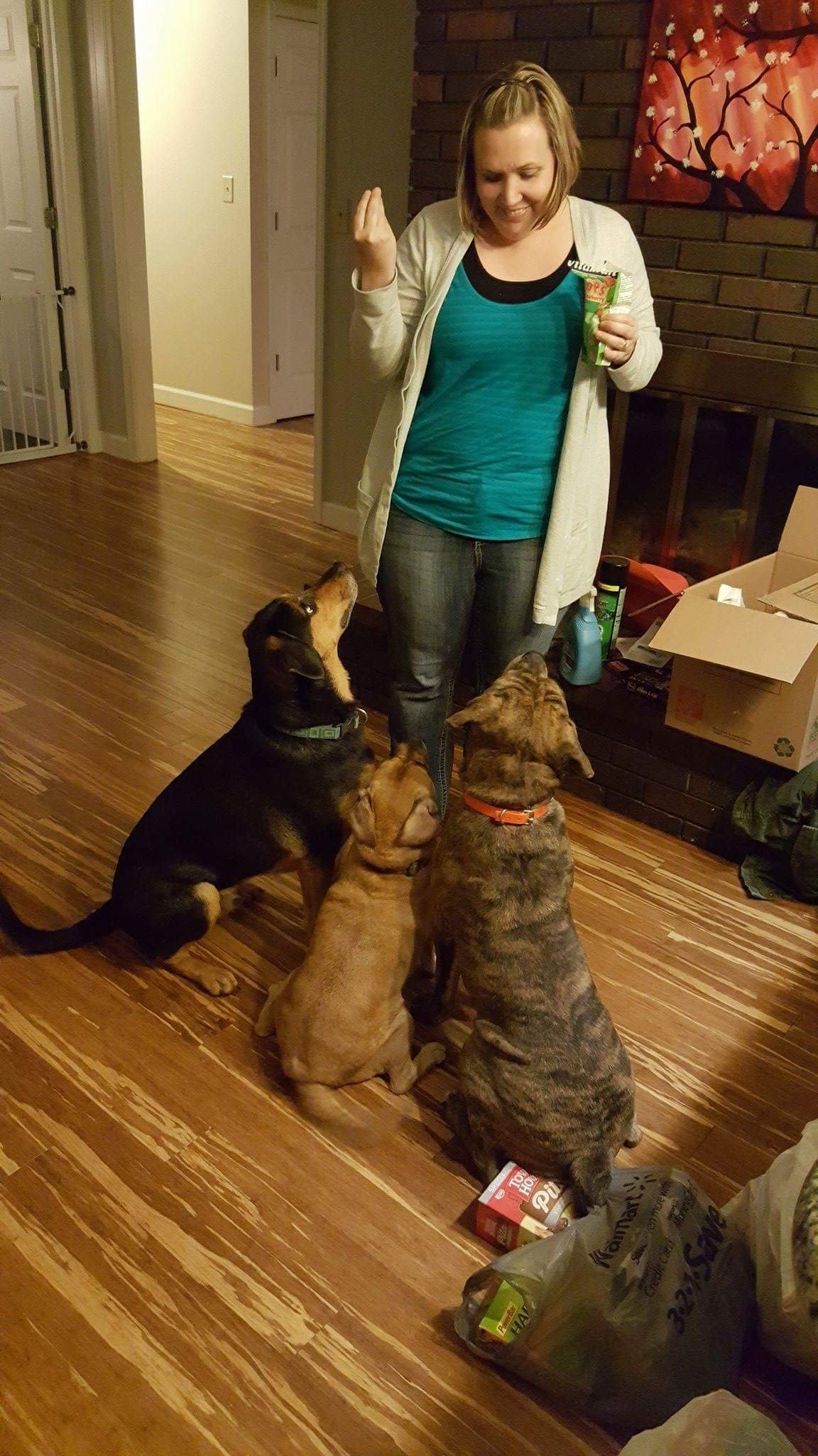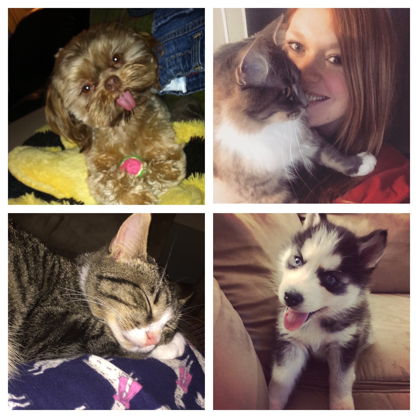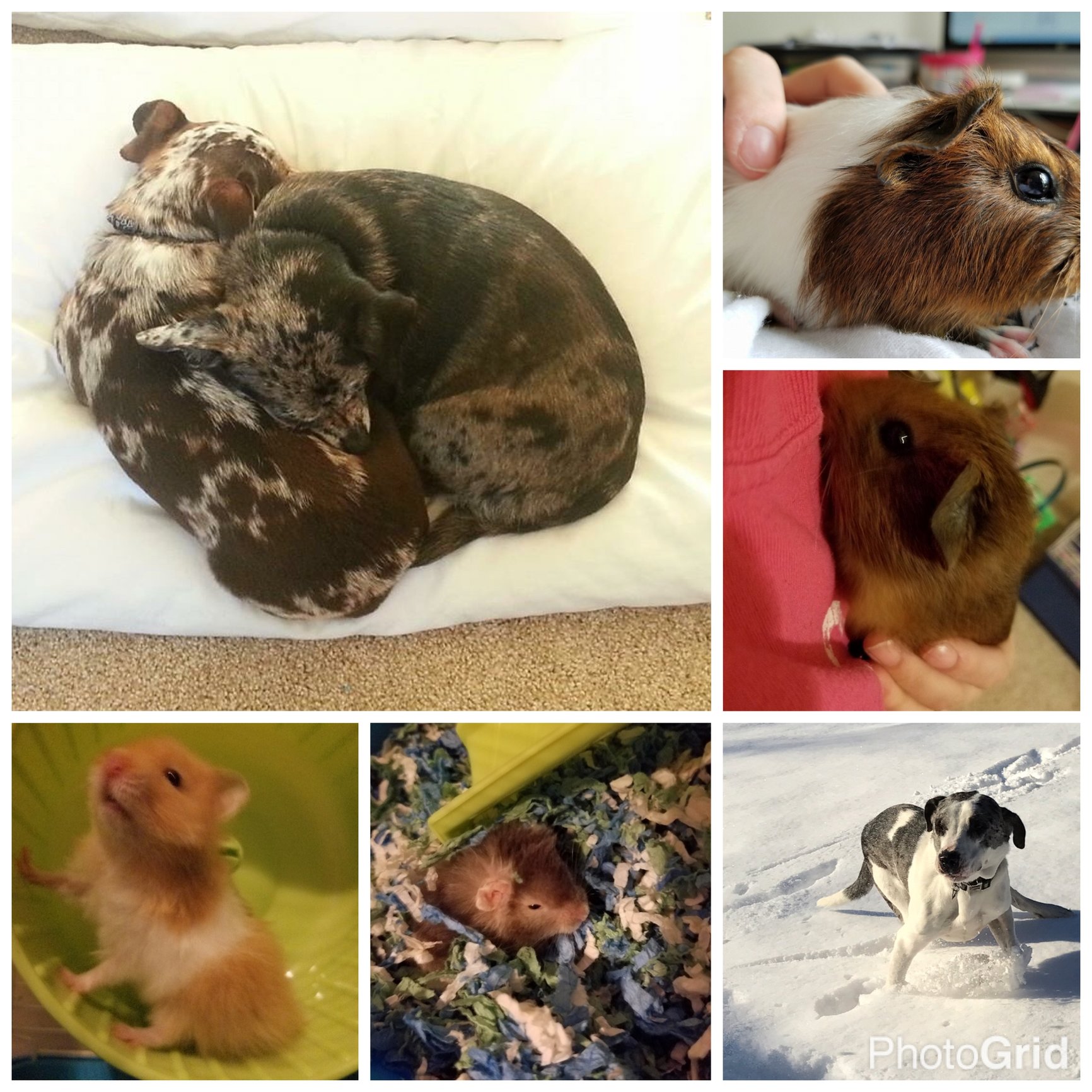 We have three dogs, a cat, and two rats. The dogs are puddles the piggies, zen the lab mix, and sailor the American bulldog/English bulldog mix. The cat's name is meow. And the rats are salt and pepper I am mobile so sorry if these are huge