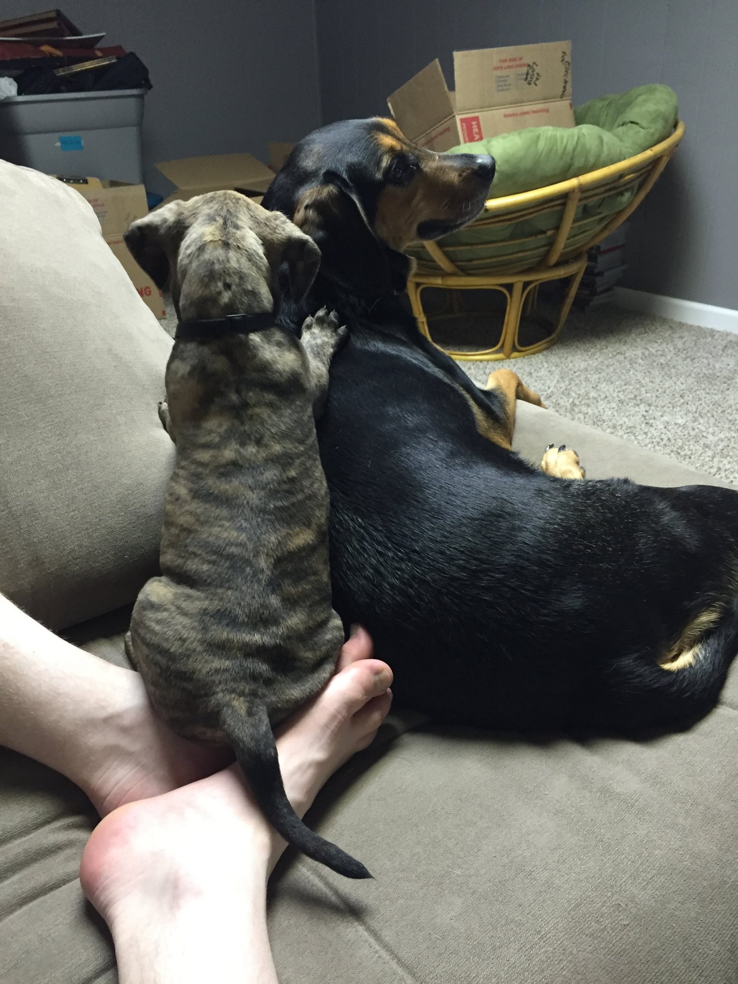 My Mama Diva and my doxie Spike. Have two more dogs, Oscar (black lab/Catahoula hound/mastiff mix) and Molly (Shepherd mix). Also have a cat, two rabbits, 17 chickens and three tanks of fish.