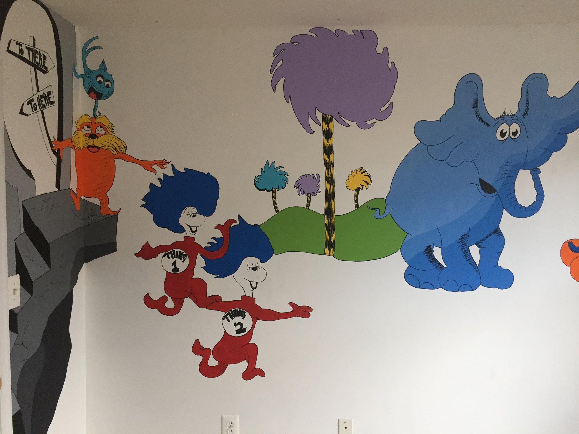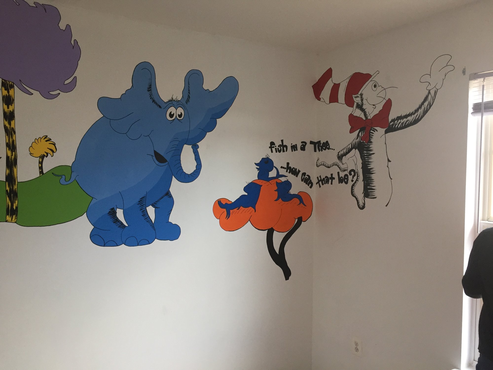 Moving into a new house that has a Dr Seuss themed mural painted on all 4 walls currently trying to decide whether or not to repaint or just let it be my son's room even though its smaller and more ideal for a nursery