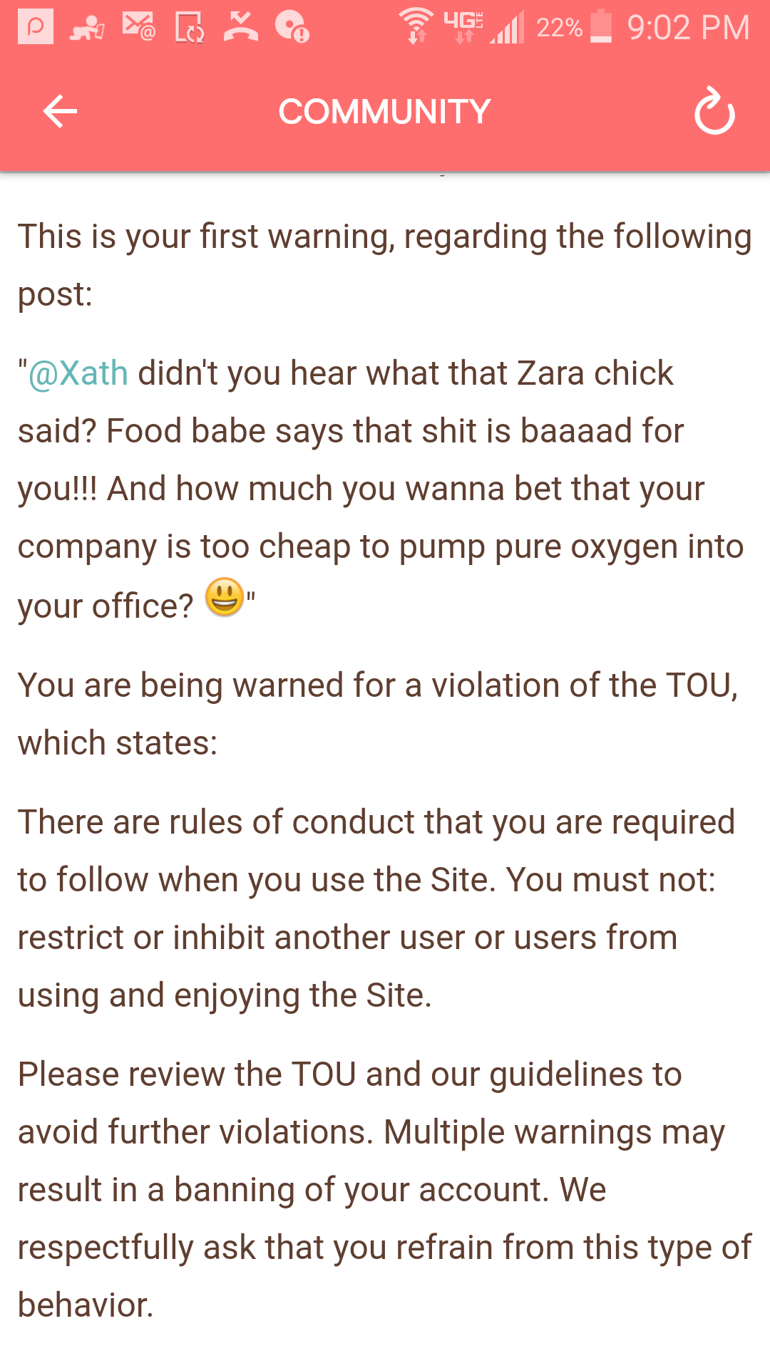 @BumpAdmin You guys are violating your own TOU by restricting/inhibiting users from enjoying your site. We can't say hardly anything without getting a warning like that. It's not right and you're working your way towards not having any users to police.