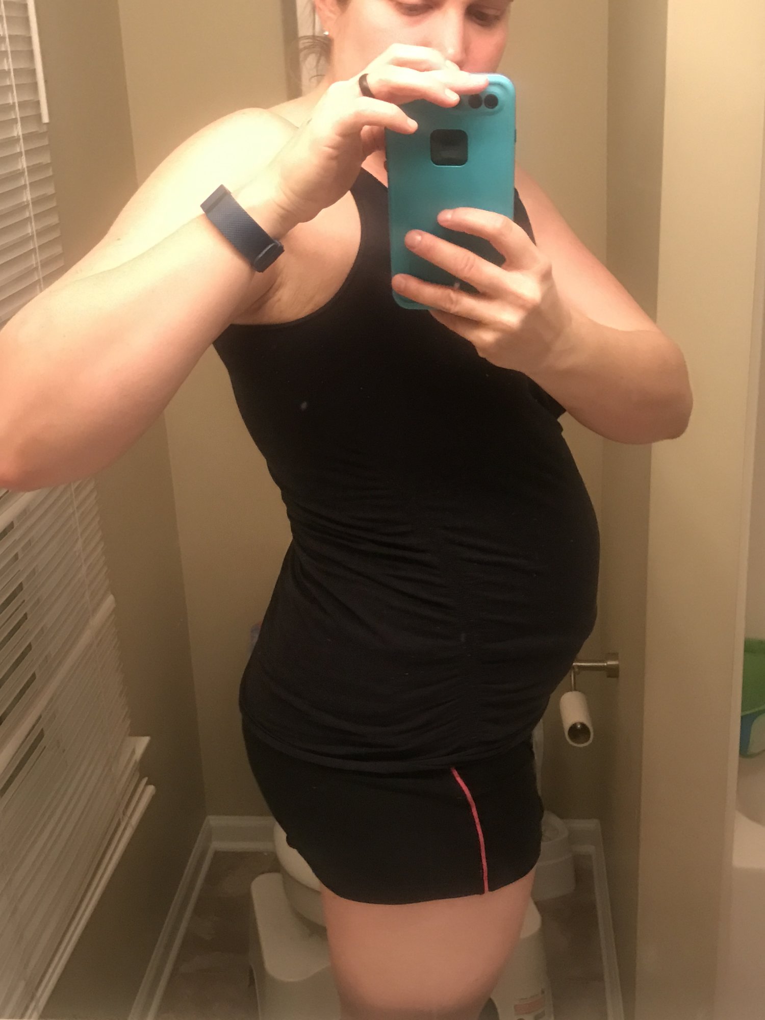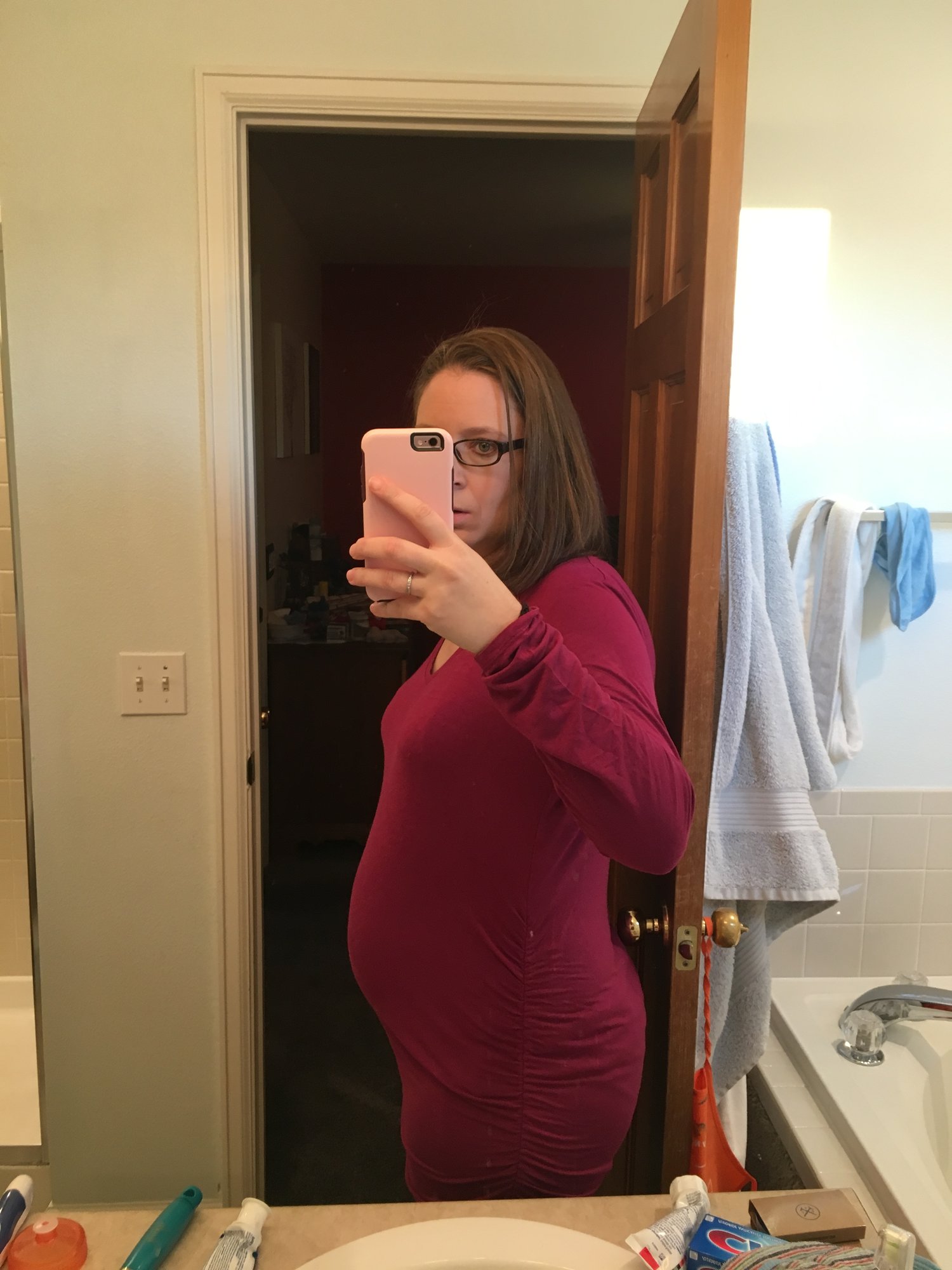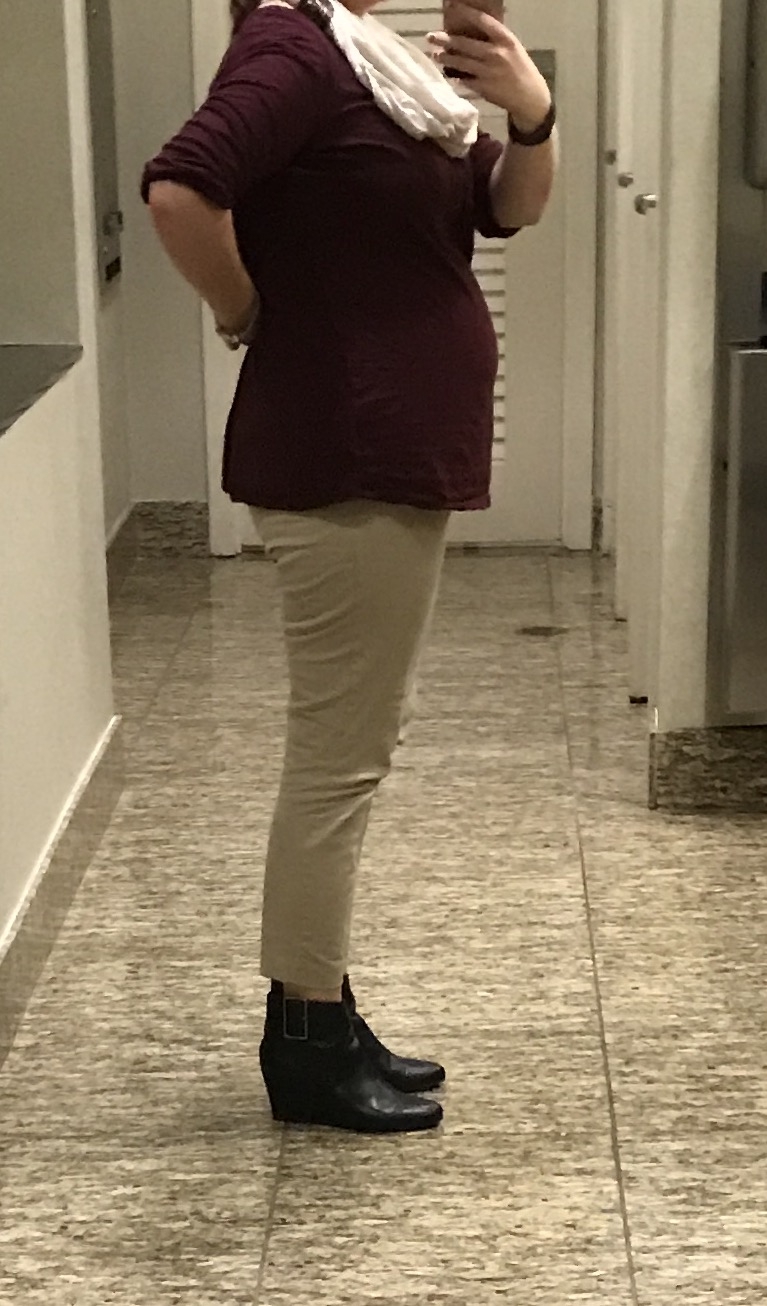 This is me yesterday in a pea in the pod skirt that I love (full panel, totally can wear it sans bump - bought it a few weeks ago when I was definitely not showing), and regular work shirt from before pregnancy (starting to feel a little tight).