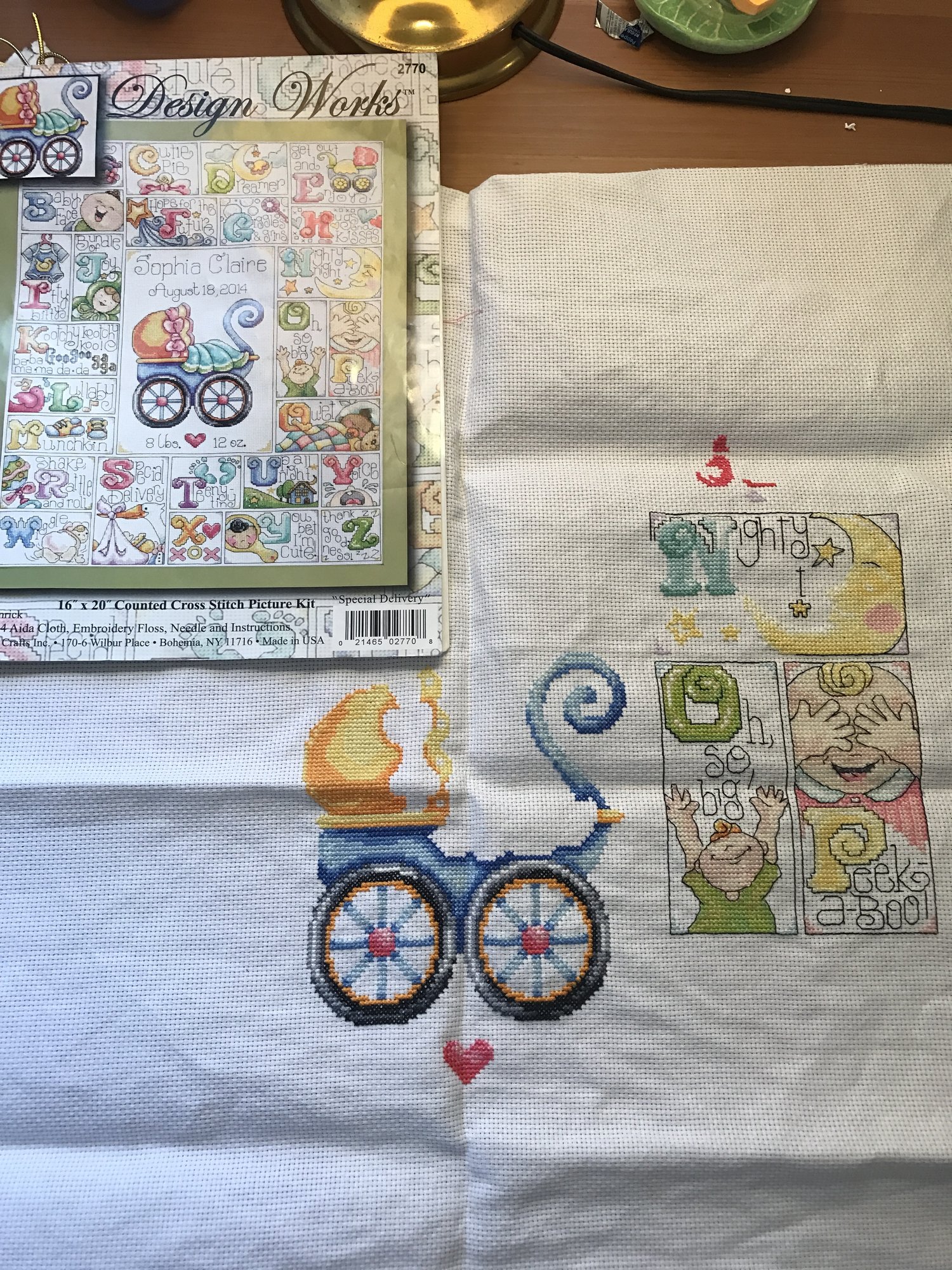 this is the pattern and and how far I've gotten on it. I'm skipping the blanket and bow on the carriage for the moment because I don't really like the blue/pink thing - I'm going to try to match the red/white plaids they had at their wedding, but I need to assess the floss I have left and check my embroidery boxes to see what I have to buy once I block it out. The pattern's available online but doesn't come with enough orange and I'm a little annoyed by having to switch to a slightly different replacement orange mid-project.