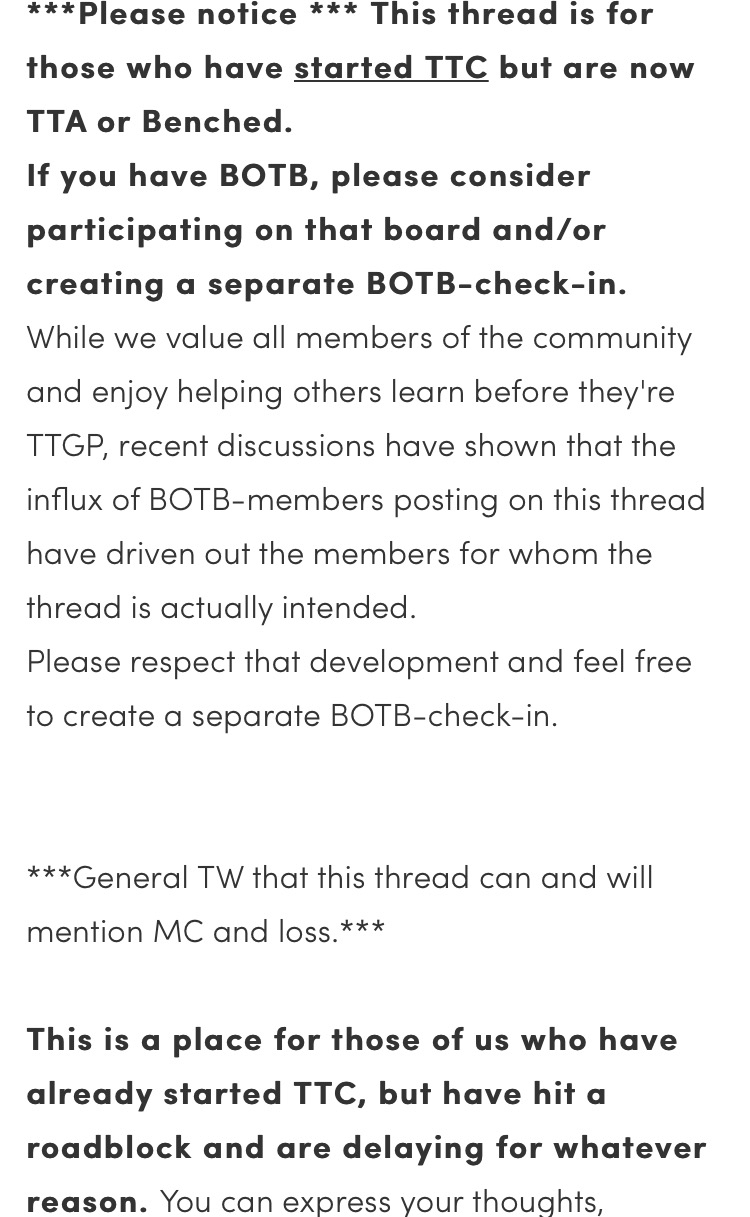 @JNCPro3130 - In the past couple of weeks, we've decided to take this thread back to its initial intent of being for those who are truly benched/tta, opposed to just BOTB. We just had a lot of people who were BOTB and posting next to some women who were going through some big issues and currently miscarrying and while there was no ill-intent, it was rubbing a lot of people the wrong way.