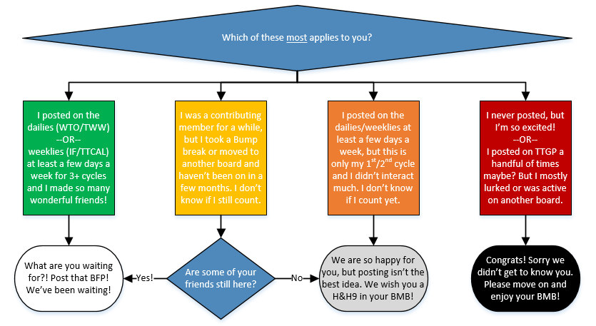 I hate to be a bitter Betty (pun intended) but changes like these have been discussed over and over again since the dawn of TTGP, and there's never really a GOOD answer. Adding that graphic won't deter anyone, because let's be honest, the people you most want to stop posting won't read it anyway. And you will alienate people who did their best to be an active member of the board, even if it was only 1/2 cycles. Yes, I know, seeing someone come and go before you hurts. But it's not their fault. And if they participated and did their best to offer support for their time here, even if it was short, let them have their moment. They deserve it. Some of the people I'm closest too got their BFPs very quickly, and I don't begrudge them that, I appreciate the support they offered during their time.