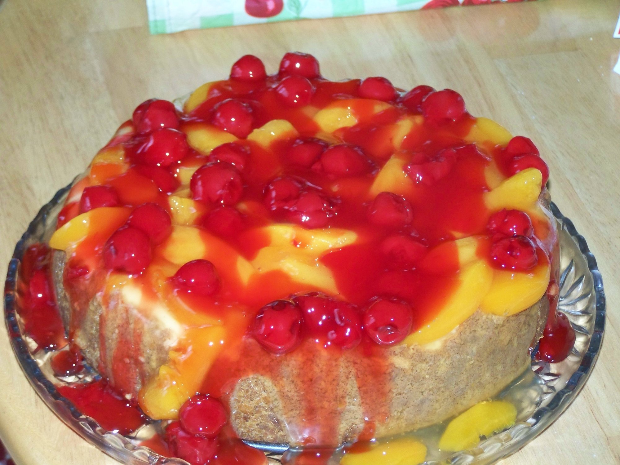 GTKY: Any food aversions and/or cravings? Most things sound gross to me. I've been eating just a little bit, not stuffing myself on my favorite foods, like I did before I was pregnant. We had birthday cake yesterday, and I only ate half of the small piece my sister gave me. The one craving that has been consistent is Italian bread and oil. Oh yeah and cheesecake. I LOVE Cheesecake. lol and it doesn't help that I LOVE making them, too. Here's a photo of a peach cherry cheesecake I made a while ago. I realize that I need to take more pictures of my work.
