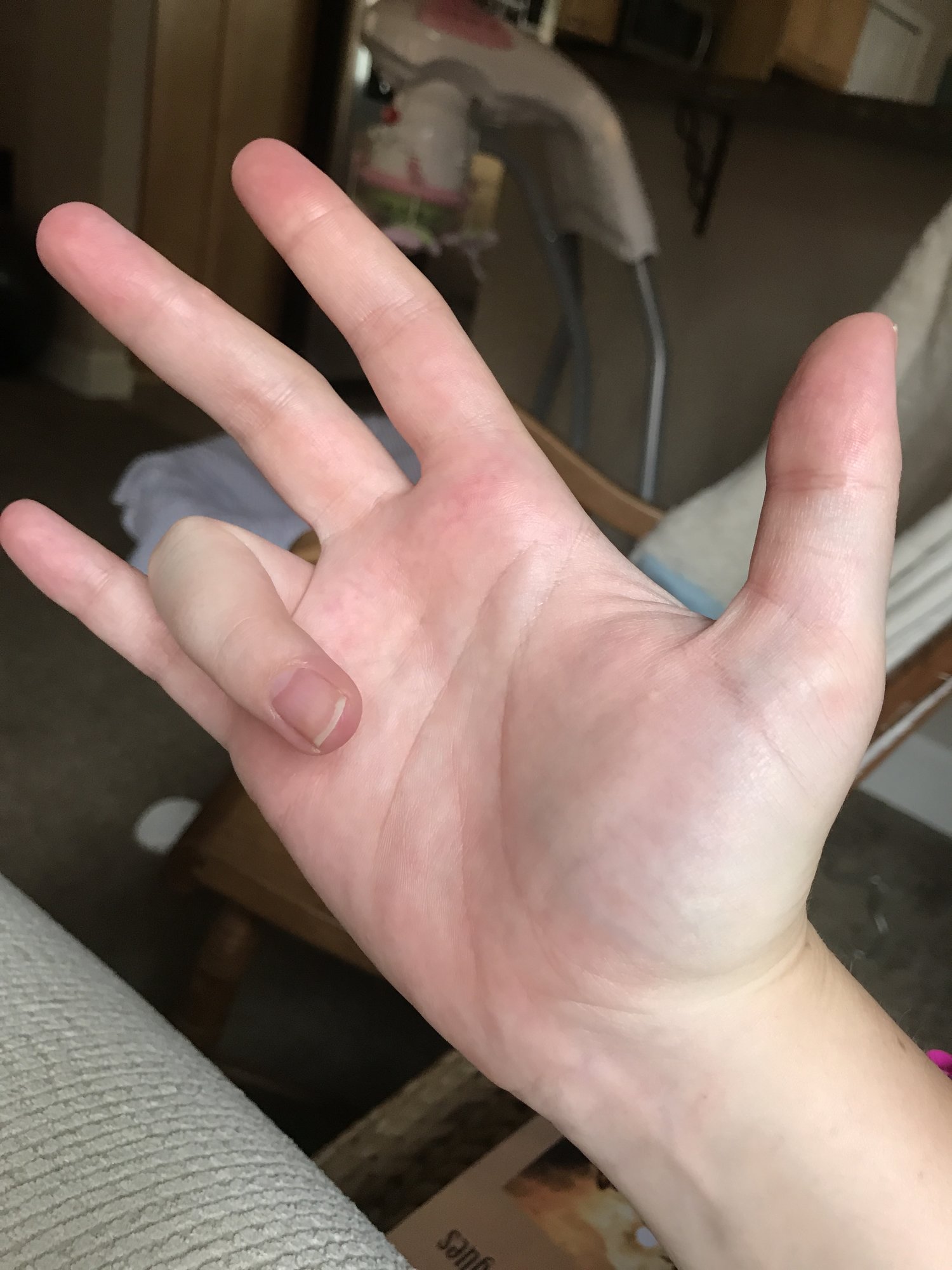 @cmmiller531 is stiff fingers a sign of something or just a symptom you're experiencing? I started having the WEIRDEST symptom about a week ago. When I wake up, my right ring finger gets caught if I try and straighten it. (See picture). I have to concentrate really hard to get it to straighten, and then it pops up! It takes a few times for it to start working normally, and this only happens when I sleep, every time. I don't sleep on my hand either. So weird! Assuming it's the swelling messing with ligaments, but it's weird that it's only one finger, one hand.