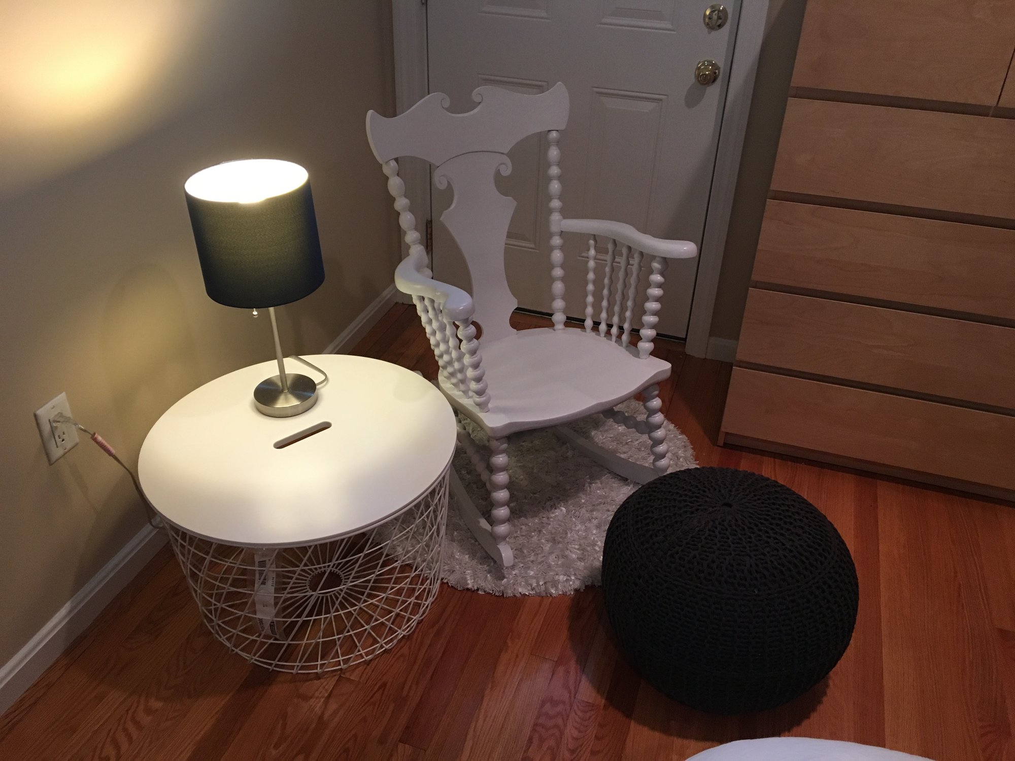 We still haven't given away/sold the furniture in the guest room that is going to be the nursery, but we've started buying some items and storing them in the closet for now. My father just finished fixing up and repainting this rocking chair that my great-grandfather built. I was bored today, so I set up everything for what i was thinking the rocking/nursing/pumping area might be once the room is finished, to see what it would actually look like. The side table is from Ikea and was a bit shorter and wider than it looked like online, but i think it would actually work out, especially if i make it the "pumping station" - plenty of space to put everything! Also, the top comes off, so we can use the basket for storing toys, blankets, etc...