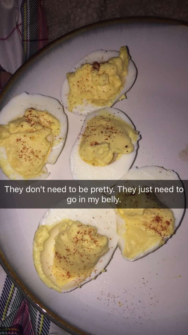 I second the love of deviled eggs, but there's something about seeing them that ruins it for me--what in the what?! Also, I'm pretty picky about how they're made. I think some people prefer a sweeter deviled egg, and that totally throws me. I prefer a savory egg!
