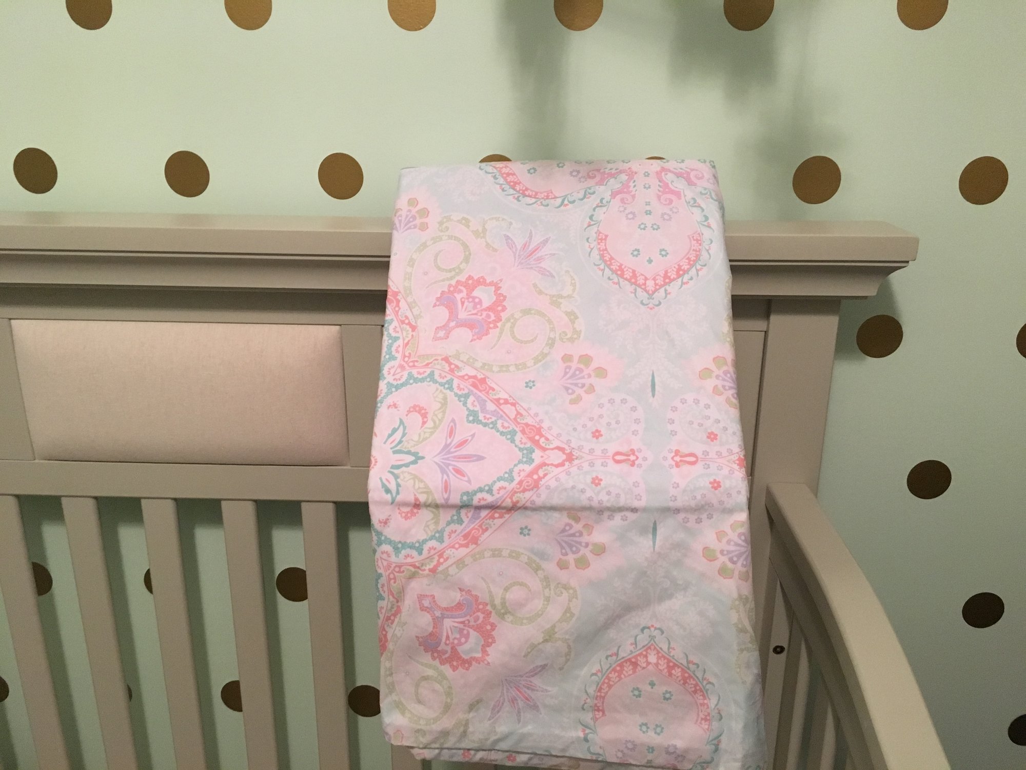 I'm a little freaked out because I thought this was my DDs room. Literally have the same paint and polka dots on the wall. I am posting a picture when she gets up from her nap!! I think I would have to see the sheets on the bed! I can't really visualize it yet