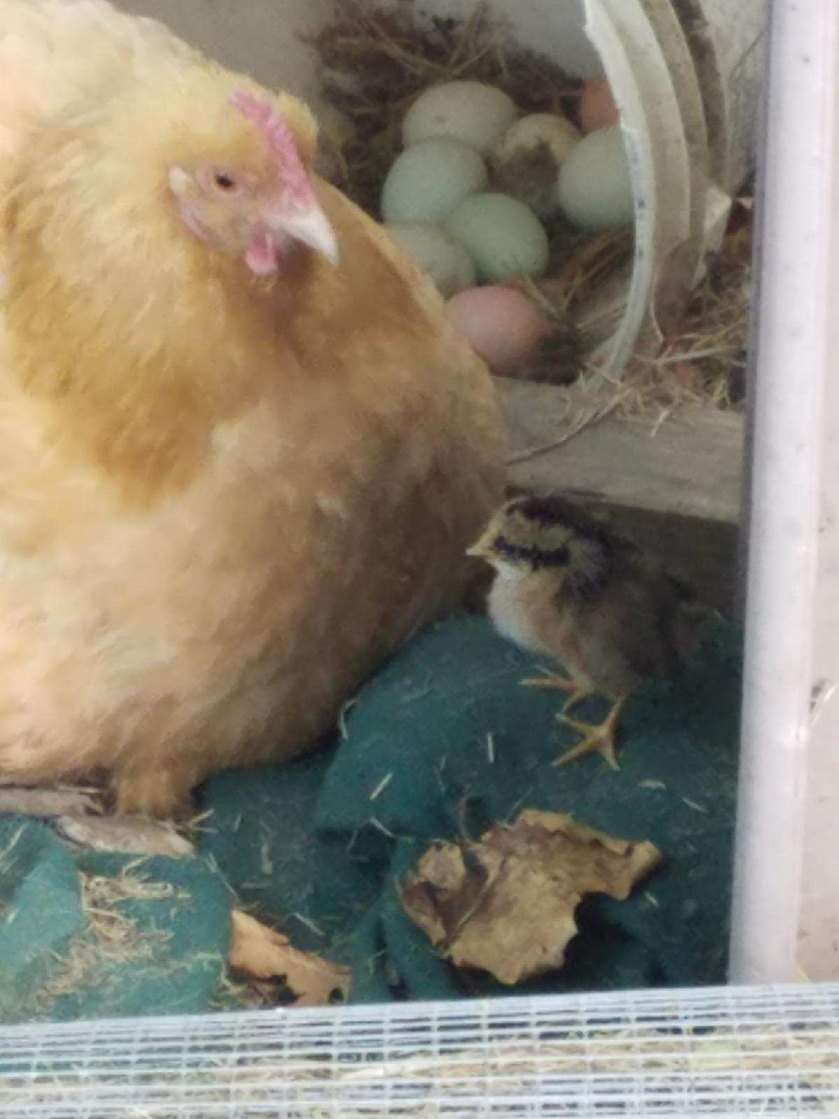 One of our hens hatched a chick! What's funny is...thays not her chick. She's a buff orpington and the chick is a leghorn. Lol She's being all mama hen and uber protective.