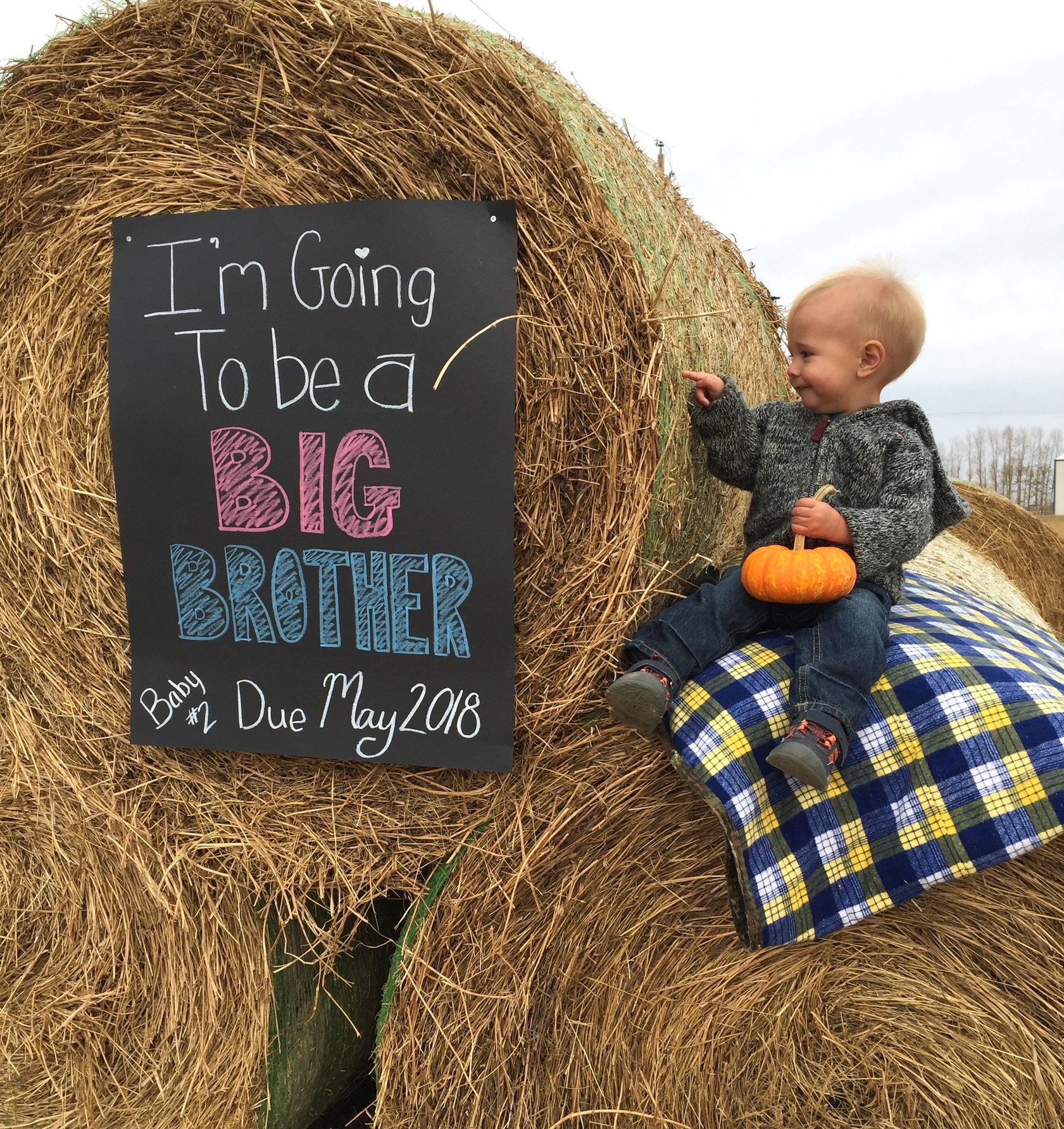 12 weeks tomorrow so we took a trip to the pumpkin patch and came up with this. Caption says, "We're so excited to add another little pumpkin to the patch!"