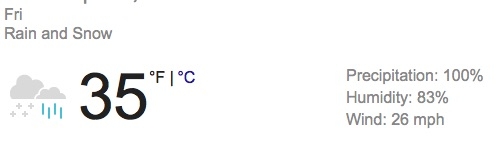 I am NOT looking forward to cooler/cold weather! I know some of you are seeing 100 degrees the last few days...yeah, this is our weather for tomorrow... 35 degrees with a 100% chance of rain/snow mix. ETA: PIP Fail