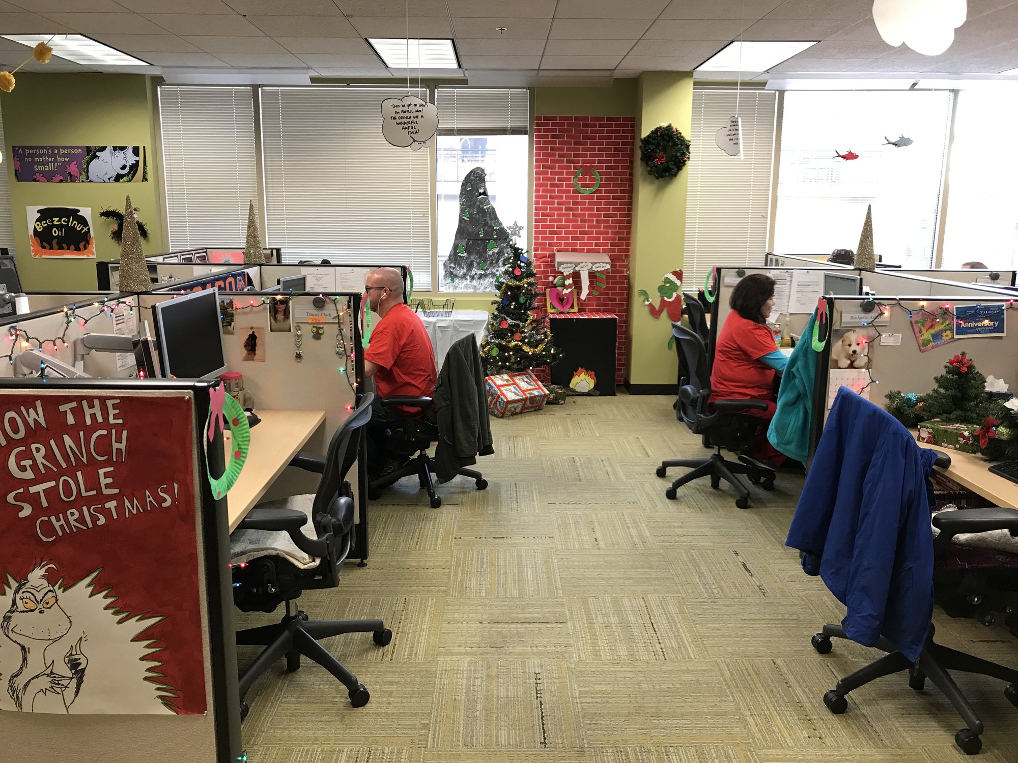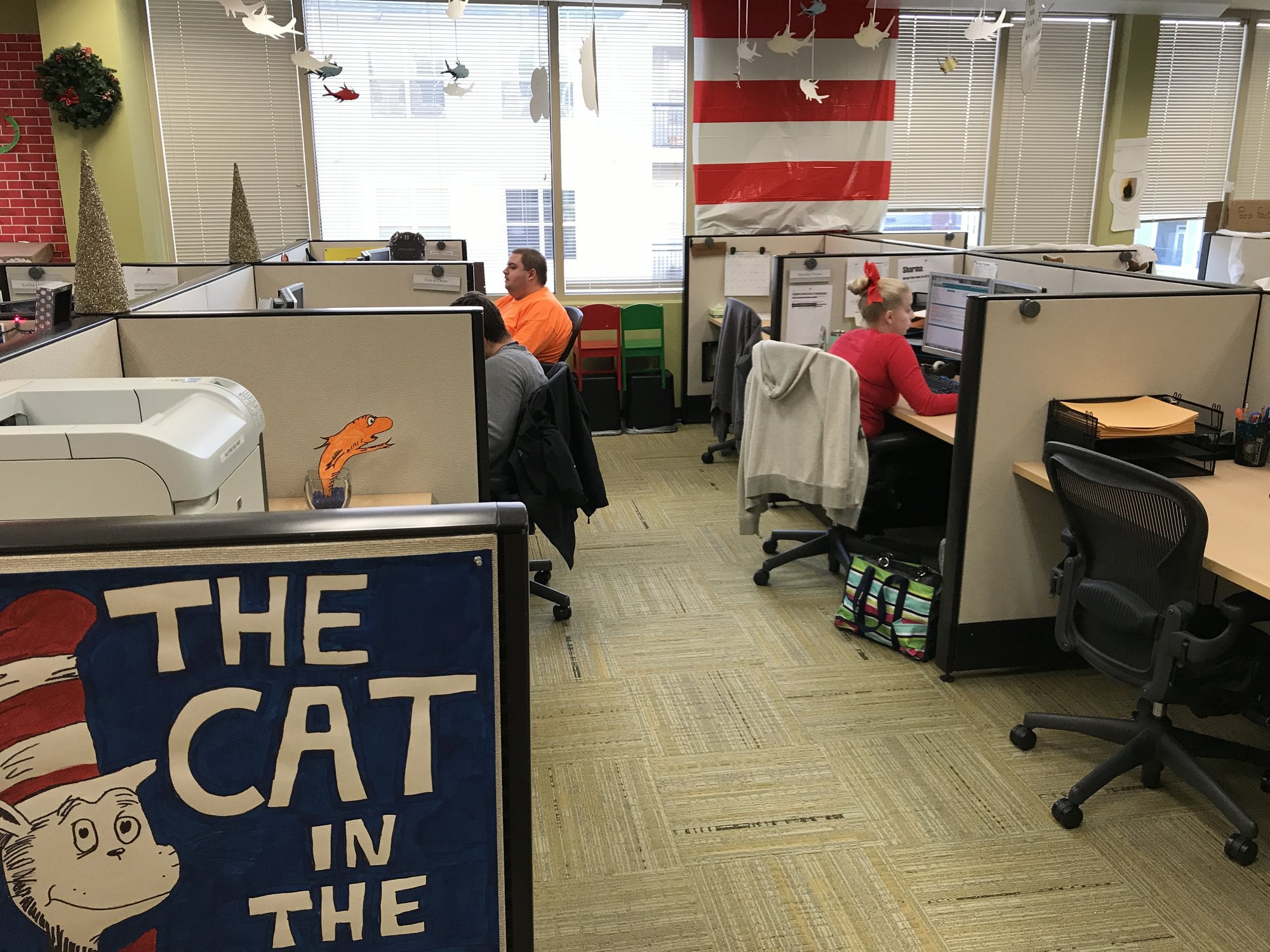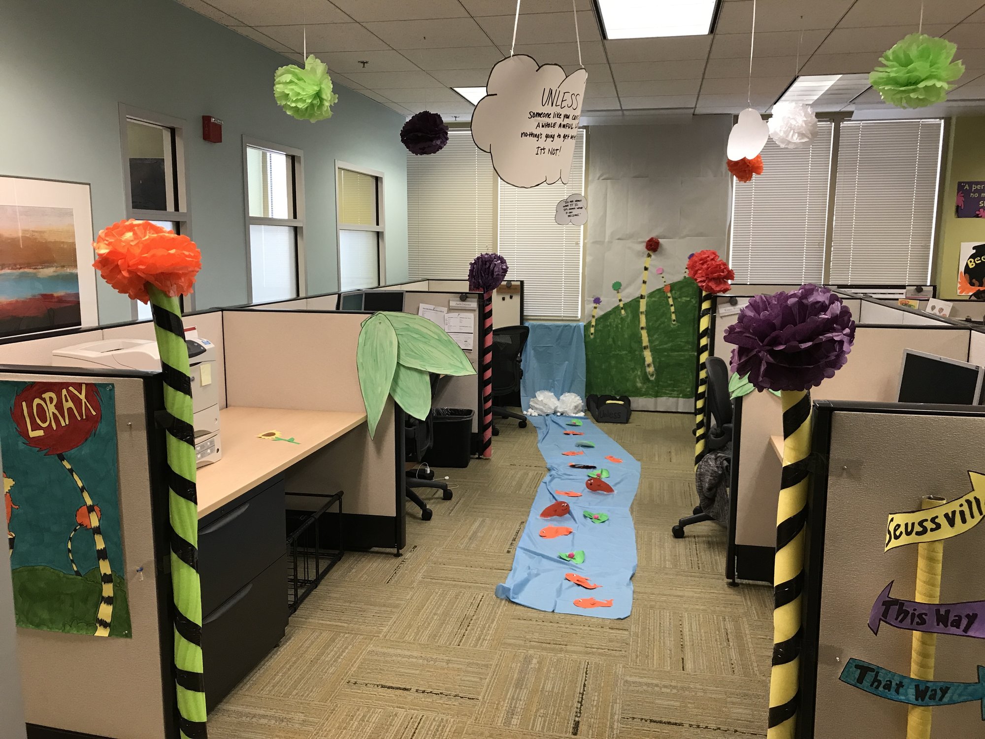 Halloween decorating was a total success! We went with a Dr. Seuss theme. Each aisle had a different book theme. A few of us didn't quite fit in, like me, as a Sneetch.