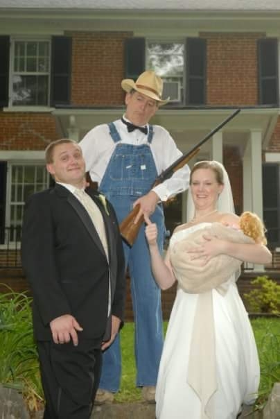 My dad, who is hilarious, decided the night before he wanted to do a funny photo op during the after-ceremony pictures. He put overalls on top of his tux shirt and got down his shotgun, wrapped up a doll in a blanket for me to hold, and grabbed Jon by the collar. "Shotgun" wedding!! It was a hit with the guests, too lol. Edit: we were not pregnant at the time, it was just a joke Dad wanted to do.