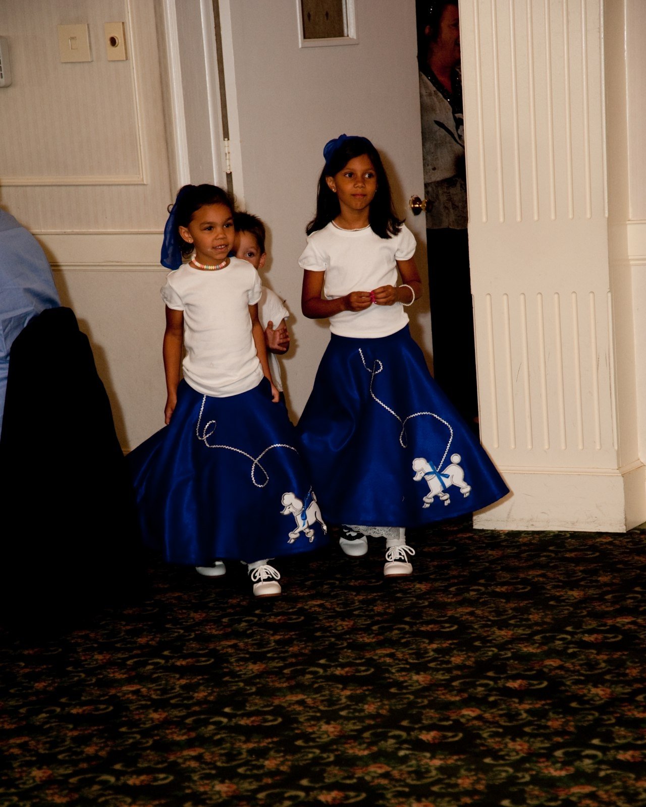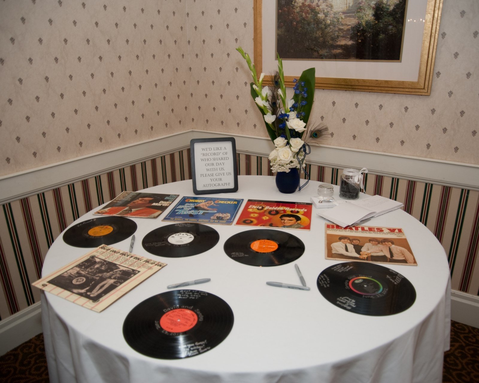 50s/60s. We had a 1963 Mercury Monterrey drive us from the ceremony to the reception, threw rice as we left the church (triple checked that it's a total myth that it doesn't harm birds and checked with the city to make sure it was allowed), had vinyl records for people to sign instead of a guest book, the flower girls and ring bearer wore poodle skirts/saddle oxfords and jeans/white t-shirt/greased back hair for the reception, a few other things.