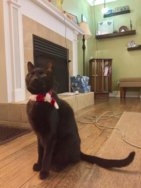 @jrm_14 Love the pic of your pets! Here's a pic of my cat in a Christmas scarf. The scarf was actually knit by a friend for a bottle of booze she gifted me for the holidays, haha