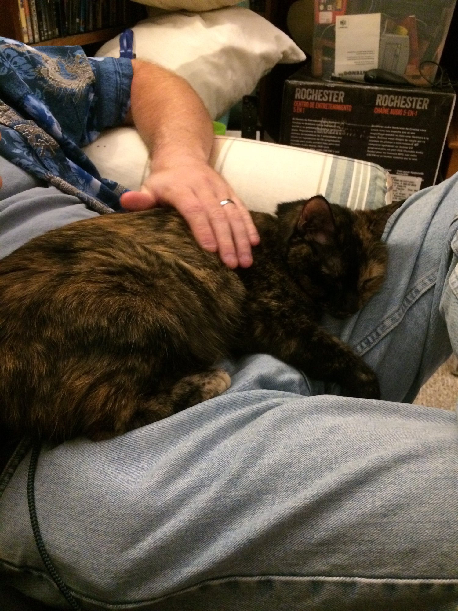 @suzycupcake From the paperwork, she belonged to her old owner for almost her entire life and was surrendered because of landlord issues. So, yeah, she seems thrilled to have a home and people who love her. She's very sweet and spends most of her time in our laps. She's curled up between us right now on the couch.