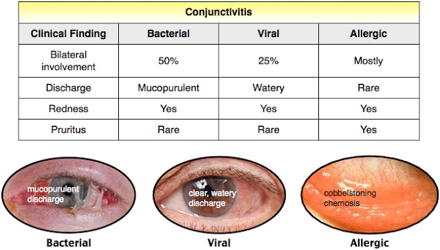 @nlc8424 I'm an NP, and I work in a hospital with adults only where I seldom have ever treat conjunctivitis. However, in basic peds/primary training that I took, the principle differences between allergic/viral/bacterial conjunctivitis are if one or both eyes are involved, what the discharge looks like, and if there is itching. Here's a handy chart:
